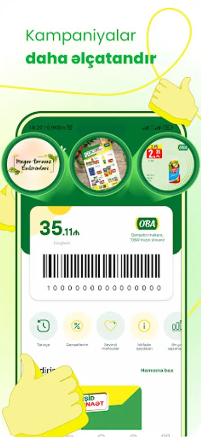 OBA Market mobil tətbiqi ilə hər 10 AZN və daha artıq dəyərində alış-verişə görə karta 1% keşbek əldə edirsiniz. Eləcə də profilim bölməsində şəxsi məlumatlara baxa və şifrənizi yeniləyə bilərsiniz.