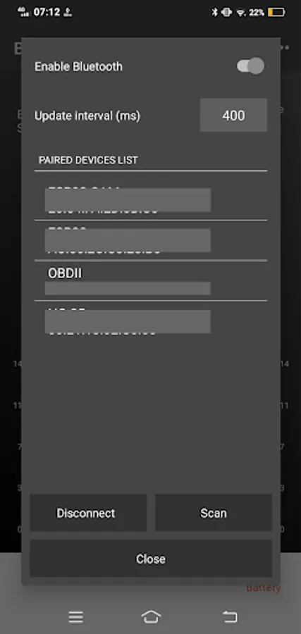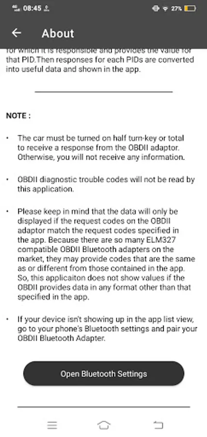 This application will request data from an OBDII Bluetooth adapter connected to a vehicle using basic parameter IDs (PID). Once you've found and connected your OBDII device to the app, the app will start collecting data from the vehicle in real-time by sending PID codes.