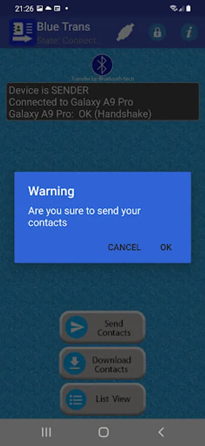 7. Press button "Send Contacts", then press "OK" on dialog interface to accept to send Contacts