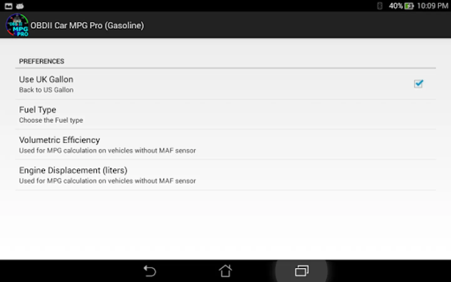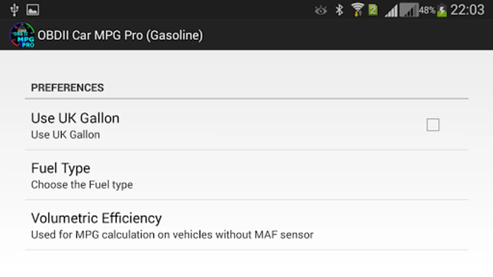 * Adds Coefficient (K) for MPG correction. (K = 1.0 is no correction / K<1 is correction down / K>1 is correction up). For example K = 0.8333 will decrease the calculated MPG. To change K go to Menu->Setting->Coefficient...