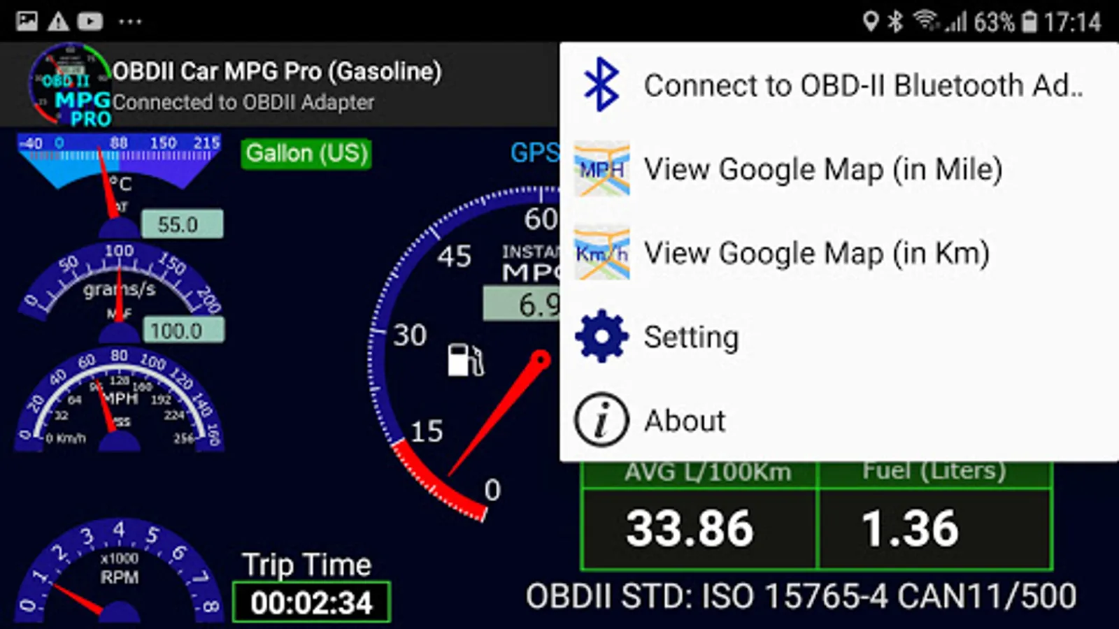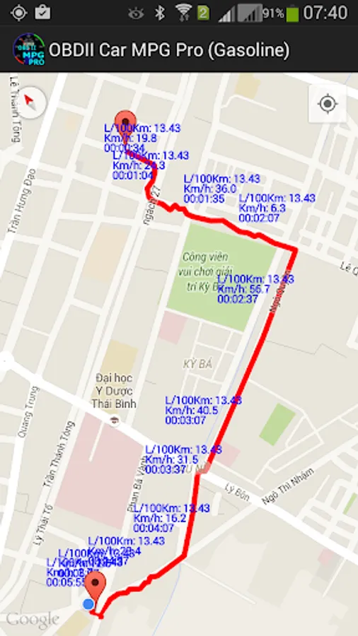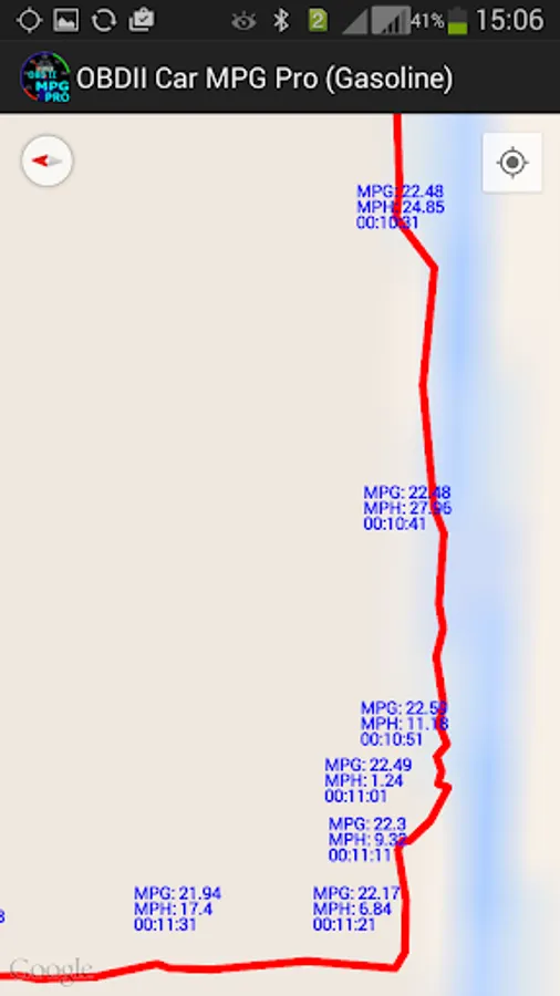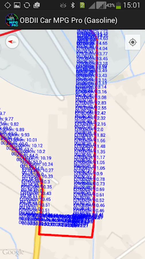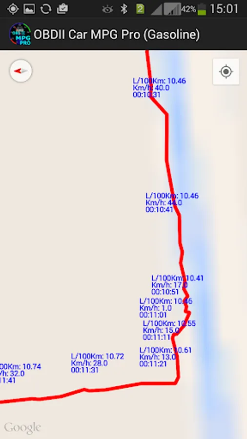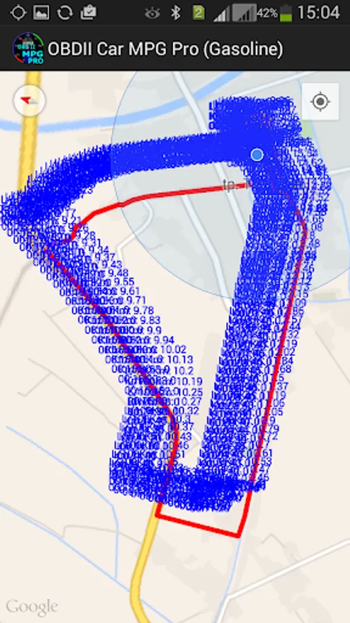 * Feature Review your route on Google Map with data of MPG(OBDII), speed(OBDII), time and GPS. This feature only works when GPS device on your phone is ON and GPS signal is strong enough (good). The app will store data into SQLite database and then can load back these data point to point with distance between points of about 30 seconds (Unit in Mile or in Km) on Google map. The data stored in database is the integration between GPS location data and OBDII data together