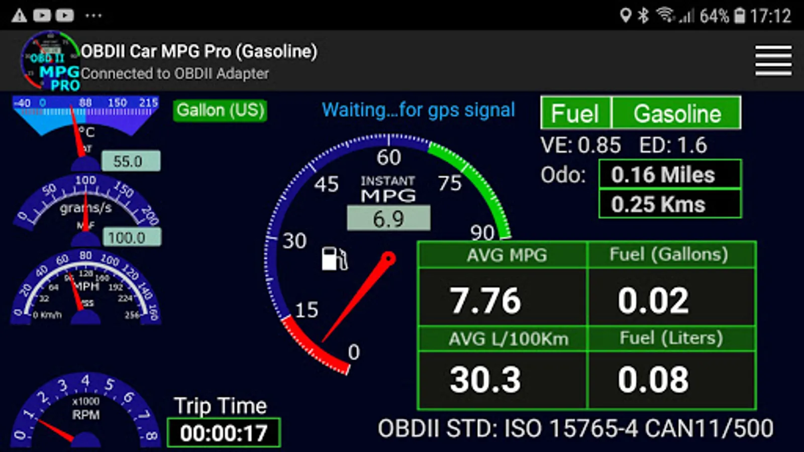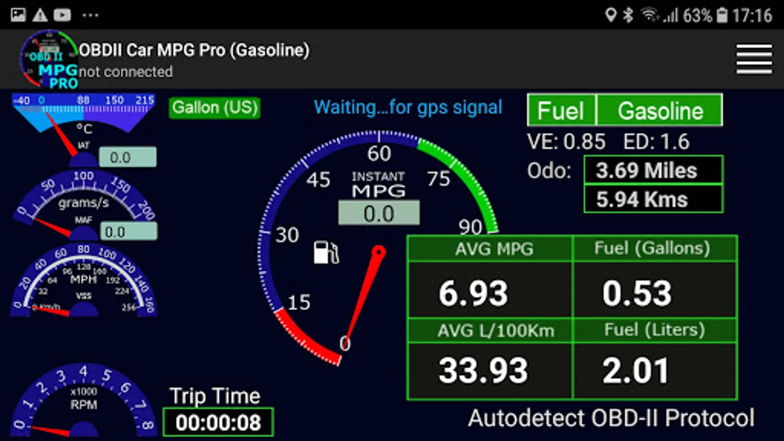 * 4 small analog gauge for IAT, MAF, MAP, VSS, RPM realtime data reading, 1 big analog gauge for showing instant MPG value and a table used to display the average (AVG) MPG, L/100Km, amount fuel consumed in Gallons and in liters