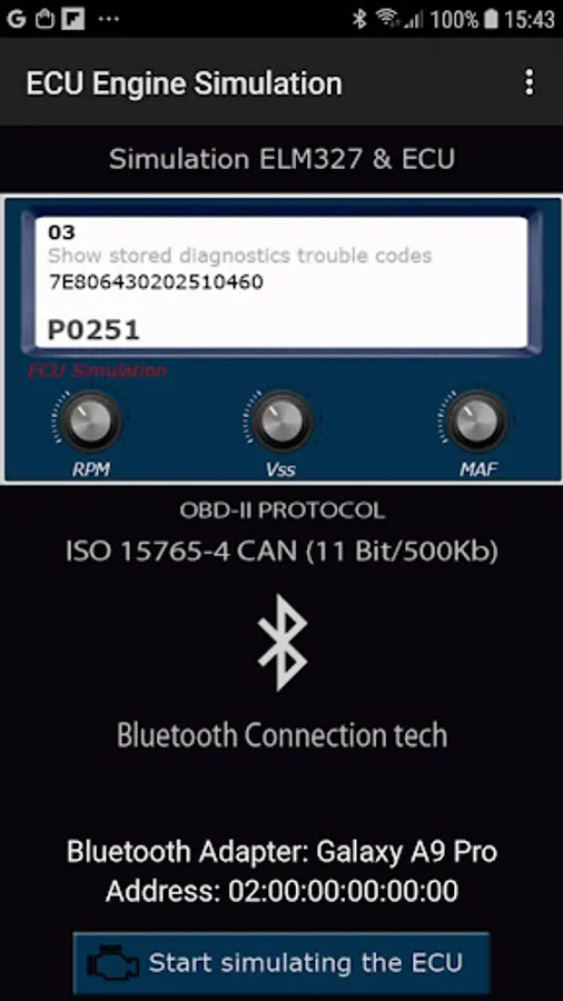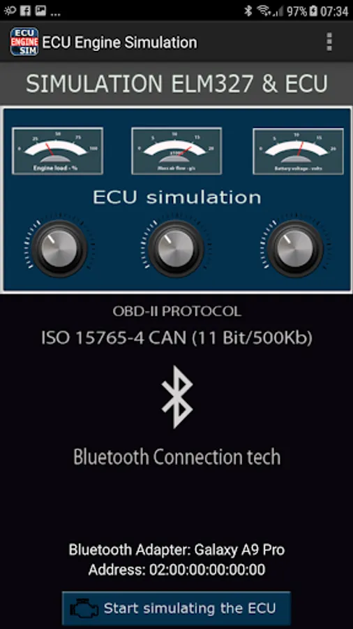 On the starting screen there are 2 information about the simulation bluetooth OBD-II adapter