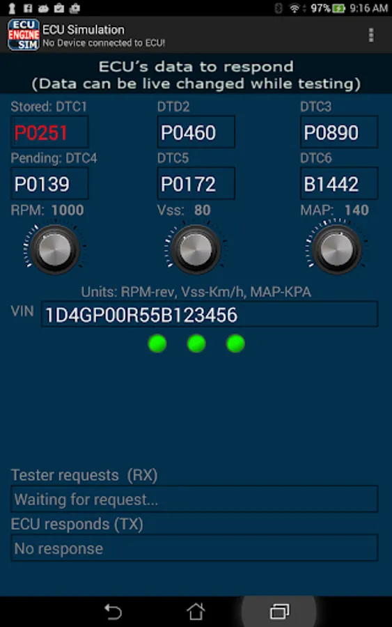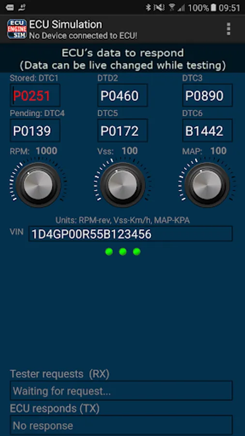Use 2 android devices (they are bluetooth paired), the one runs this app (ECU) and the other runs an android OBDII app for testing