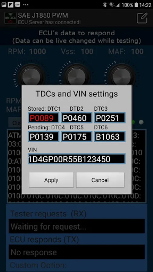Press button "Start" to start the ECU simulating process, the data like DTCs and VIN that are visible only on a dialog screen (menu Edit) can be modified