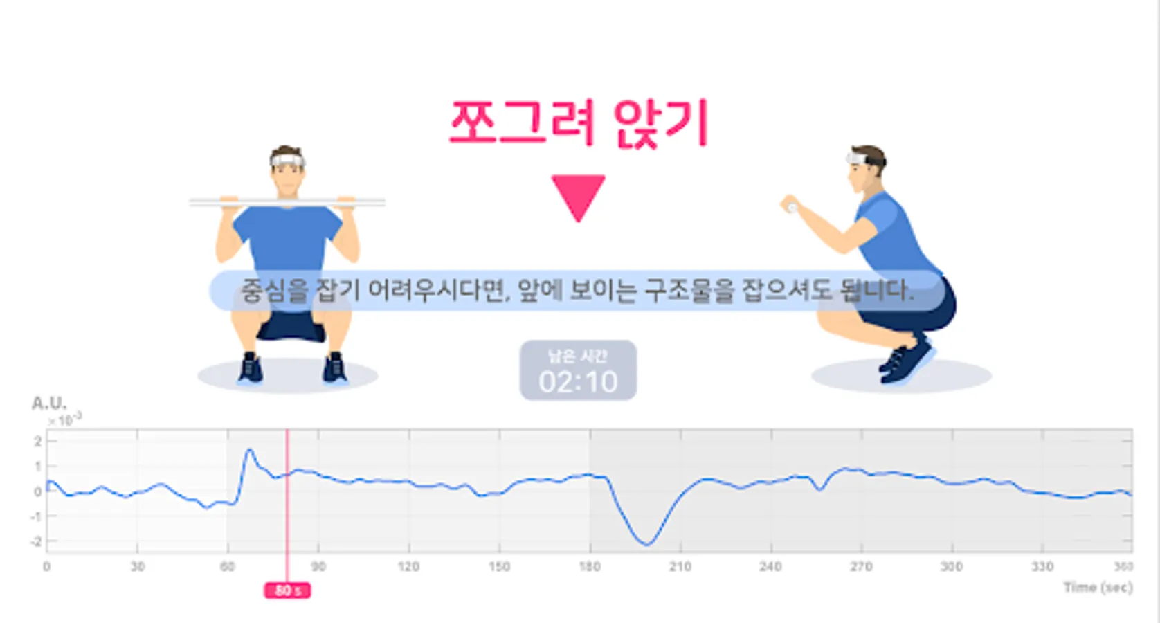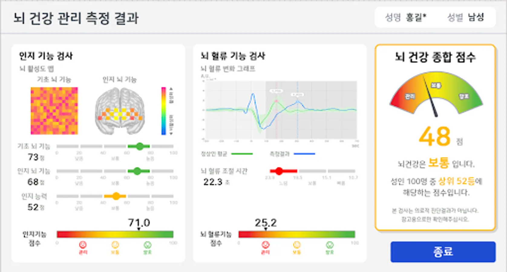 For the test, if the testee performs the test on his/her own according to the guidance presented on the screen for about 10 minutes after wearing the equipment, the test result can be checked on the screen immediately after the test is finished.