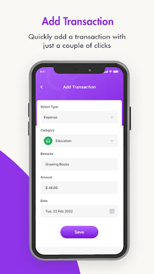 - You can quickly add a transaction with just a couple of clicks.