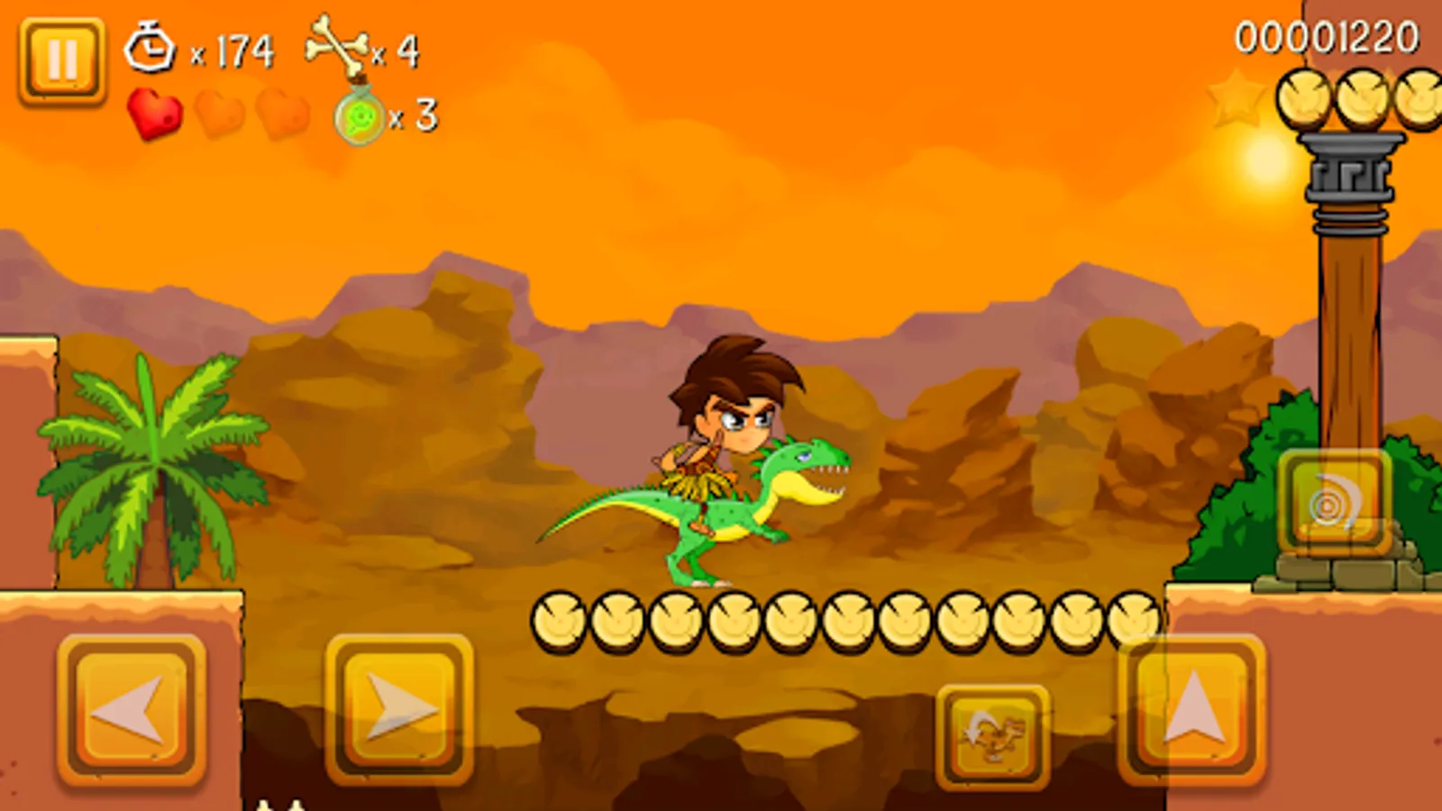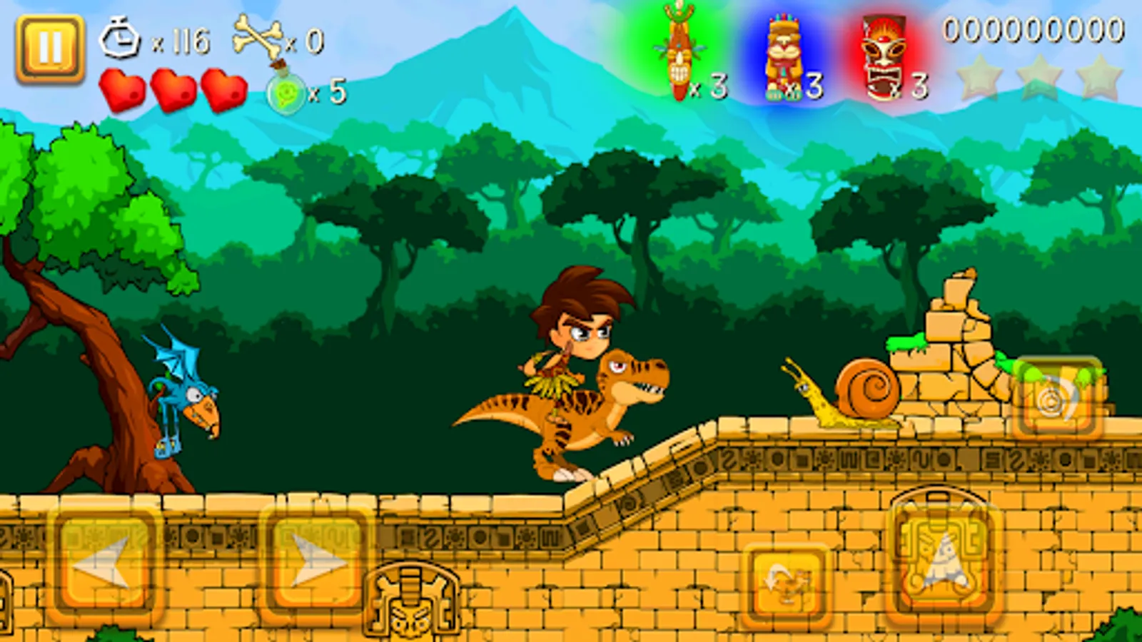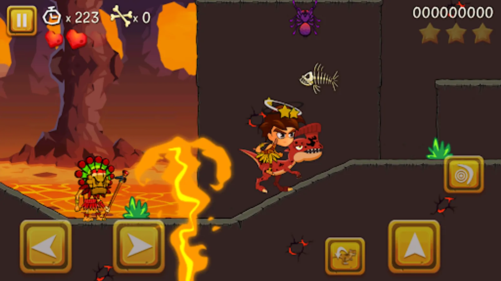 In Super Warrior Dino Adventures - The Mask Legend, you play the role of a young warrior boy whose destiny is to claim his throne and restore peace and unity between the tribes. For that, you can count on your dinosaur friends and powers encapsulated in totems that will help you in this adventure.