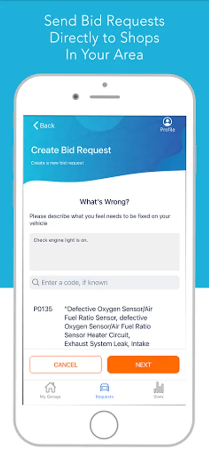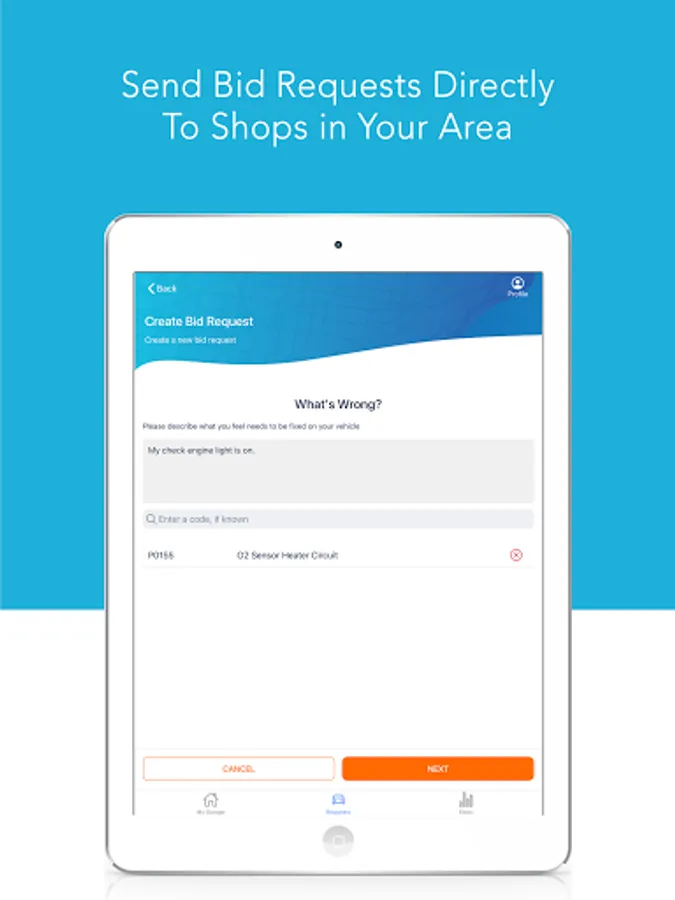 Our innovative app connects you directly with local auto repair and maintenance shops to gather quotes on your service request. You select the shops that quote and message shops directly through the app. If your vehicle's check engine light is on, you can enter the diagnostic codes to home in on the problem. After selecting a shop and dropping off your vehicle, you'll see its progress each step of the way.