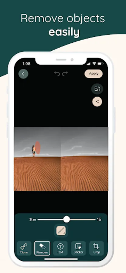 Erase Objects: Remove unwanted elements or distractions from your photos effortlessly. Our app's eraser tool lets you precisely eliminate any object while maintaining a natural and seamless look.