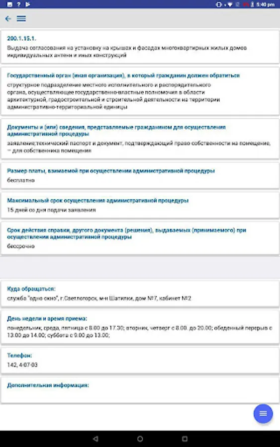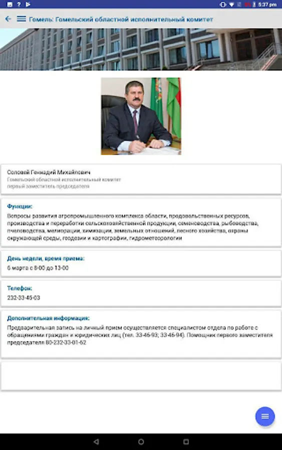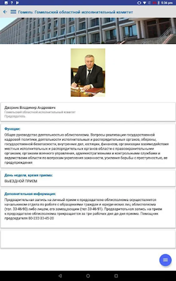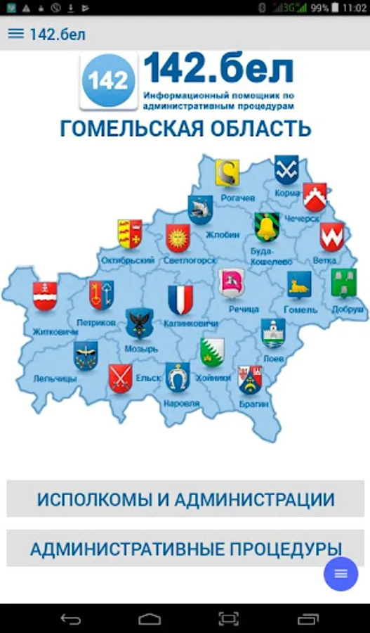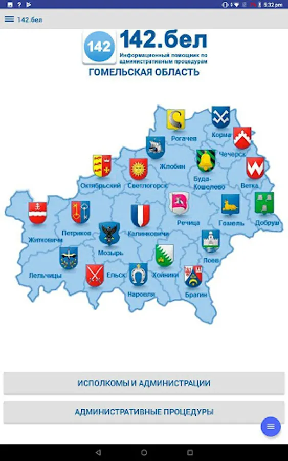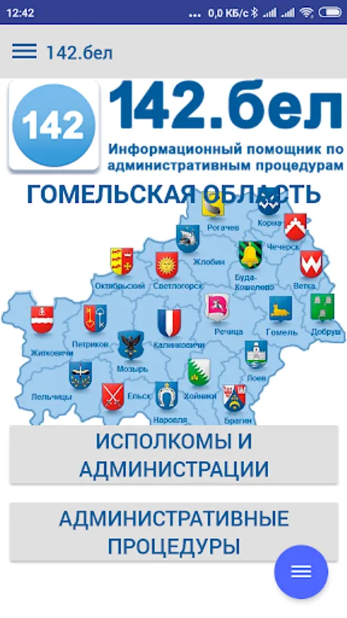 The application contains complete information on the procedure for resolving administrative procedures, in accordance with legislative acts of the Republic of Belarus, reception schedules by responsible persons and the leadership of the regional executive committee, city executive committee, administrations of the city of Gomel, district and rural executive committees of the Gomel region and deputies of the city, regional and district councils, is an additional function of the current telephone and SMS service - "142 - Telephone Reception".