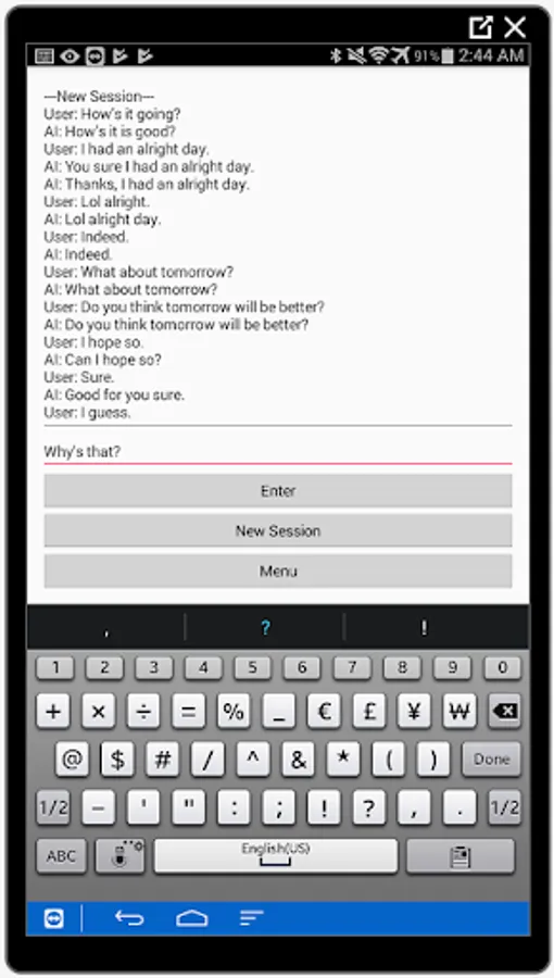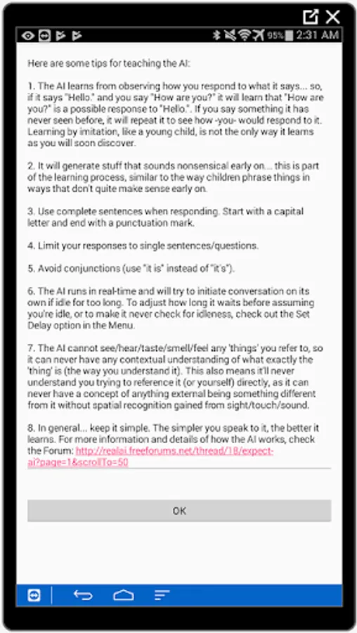 This app is an experiment in the Natural Language Processing field of Artificial Intelligence and is not intended for mere amusement, but it has no other real practical application. This is not a gimmick with pre-programmed responses, ridiculous side-apps to attempt to be your personal secretary, or any form of ads to profit from you. This is not a glorified search engine. This is Real AI. It learns through the process of being taught language organically (a process of exchange and repetition) and starts with no prior knowledge. To regard it as a child who is just learning to speak is appropriate.