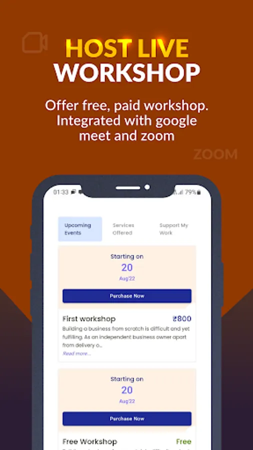 Create beautifully designed workshop pages with integrated meeting links & payment option.