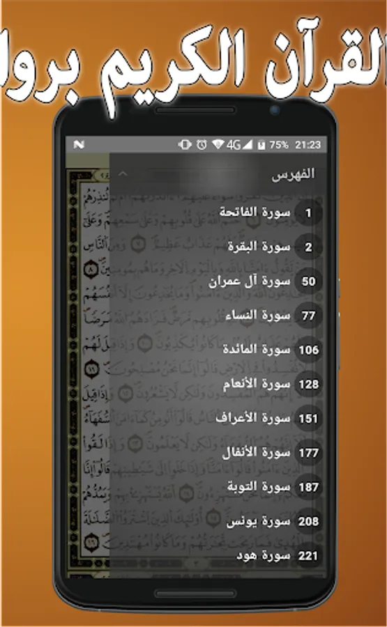 • After opening the application of the Holy Quran Warsh Nafie can sail in the doors of the application of the Holy Quran Warsh from Nafi either dragging a list of the right, to show you a list of browsing on the application of the Holy Quran Warsh from Nafi doors.