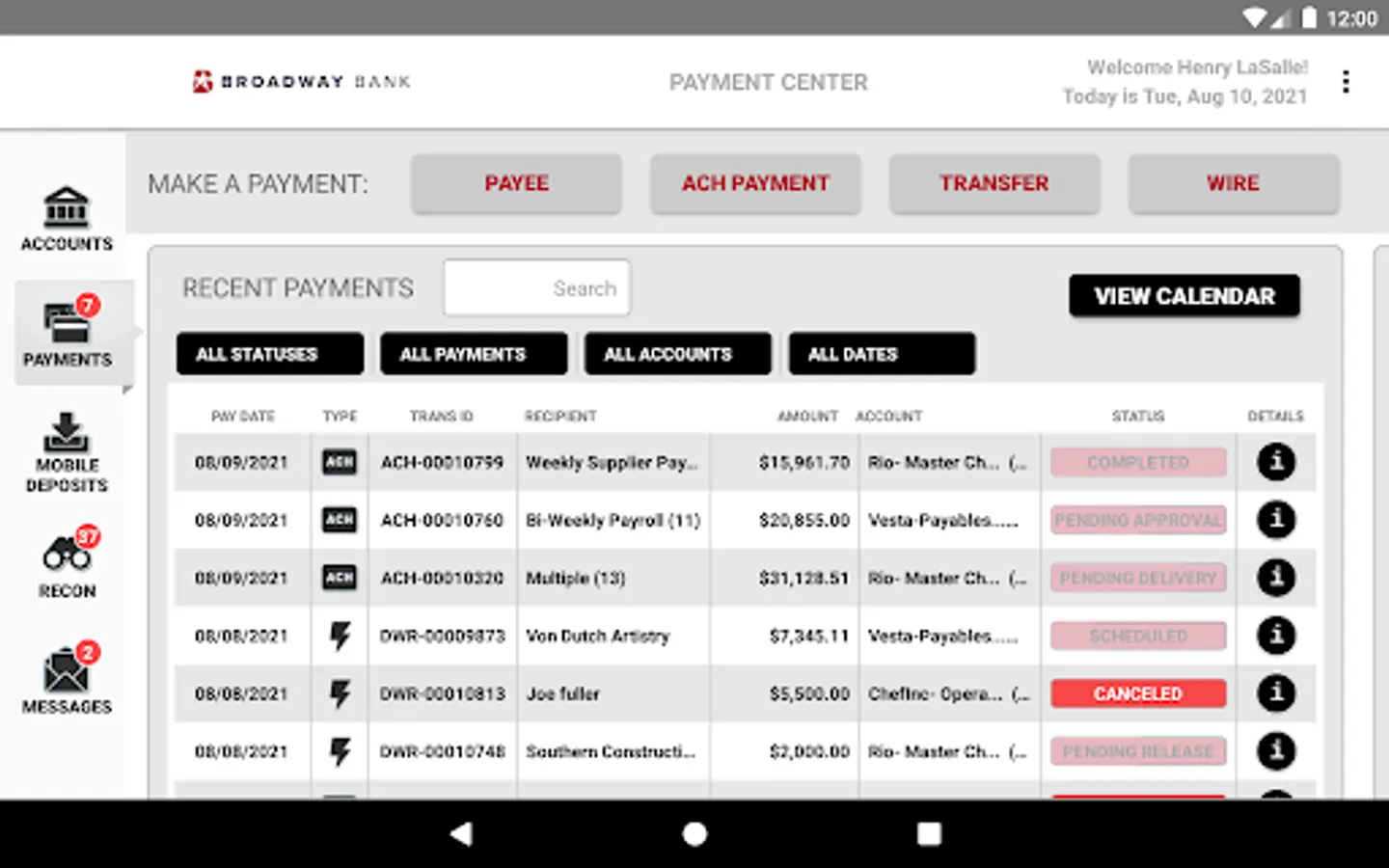 - Approve ACH and wire transactions