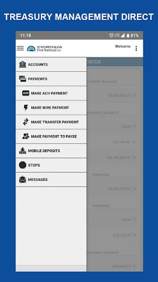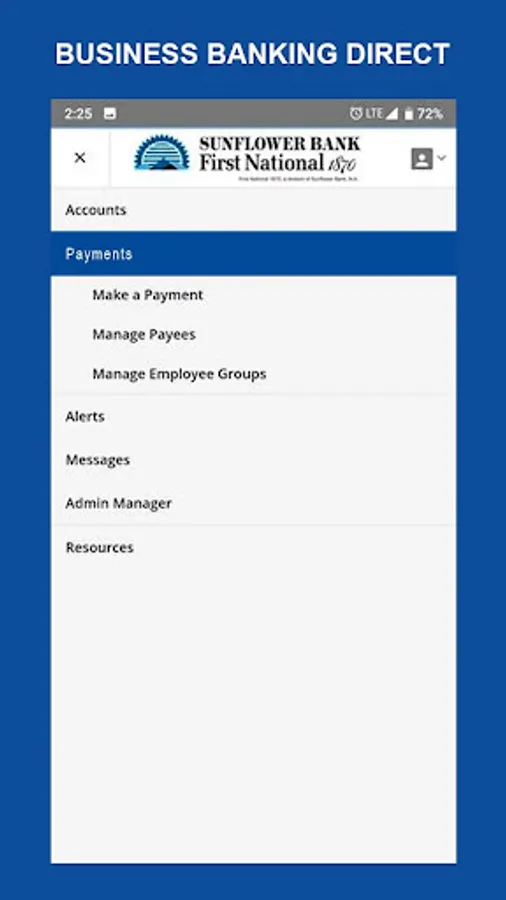 The Direct mobile app provides Sunflower Bank and First National 1870’s business customers with access to Treasury Management Direct and Business Banking Direct anytime, anywhere.