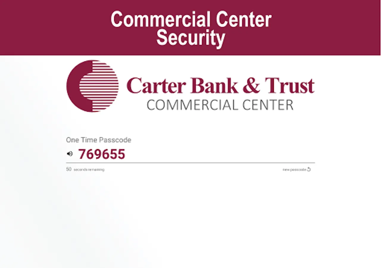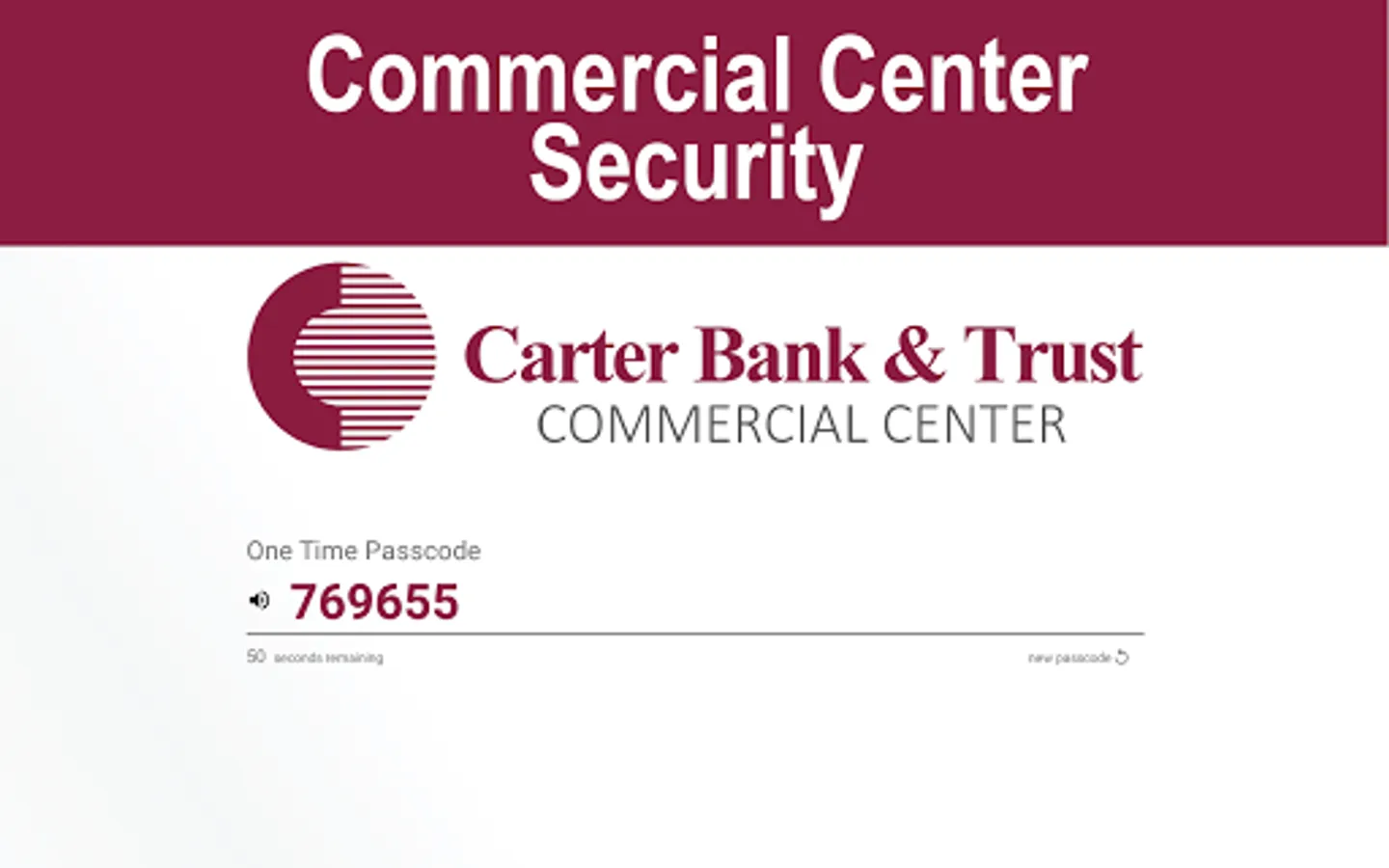 Carter Bank & Trust Commercial Center Security's Mobile App protects your Commercial Center, your commercial banking and cash management application from Carter Bank & Trust..
