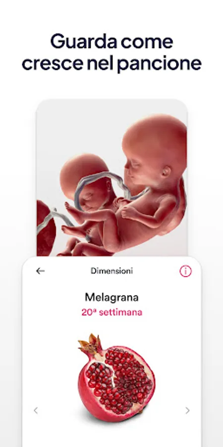 With iMamma you control every aspect of pregnancy, single or with twins. You have information about pregnancy progress week by week with lots of texts and videos. Imagine what your baby will look like thanks to the 3D fetus and compare it to fruits and vegetables based on size! You can calculate the expected date of birth and mark sexual intercourse, symptoms, moods and pregnancy tests!