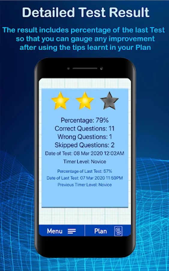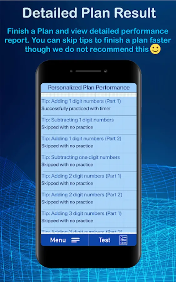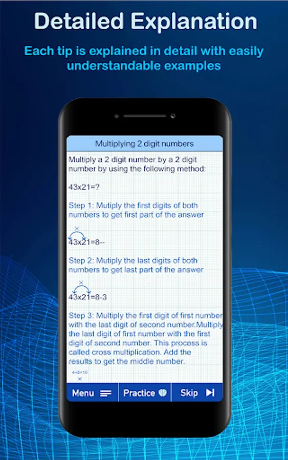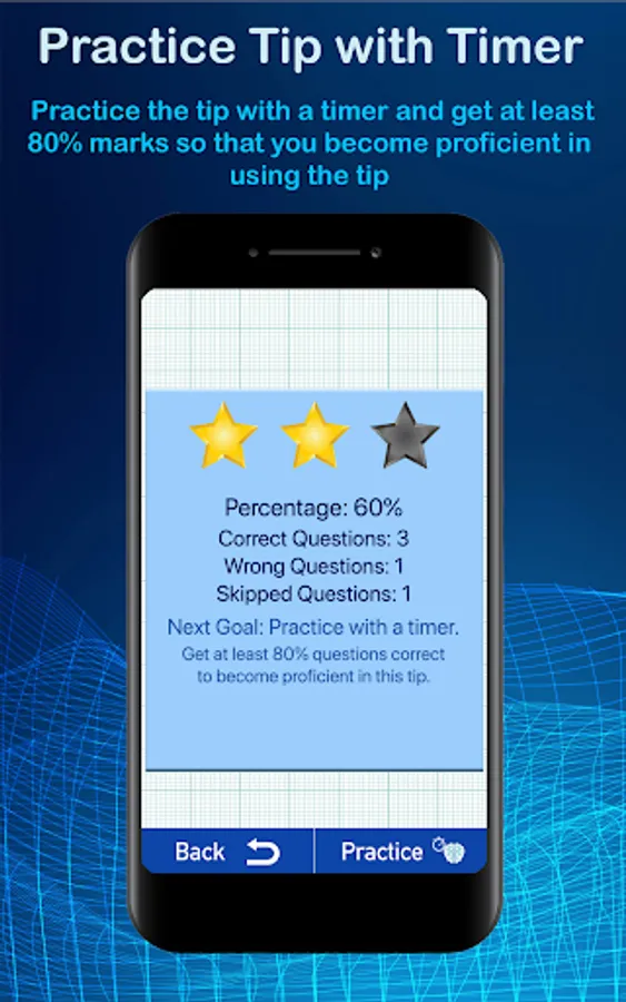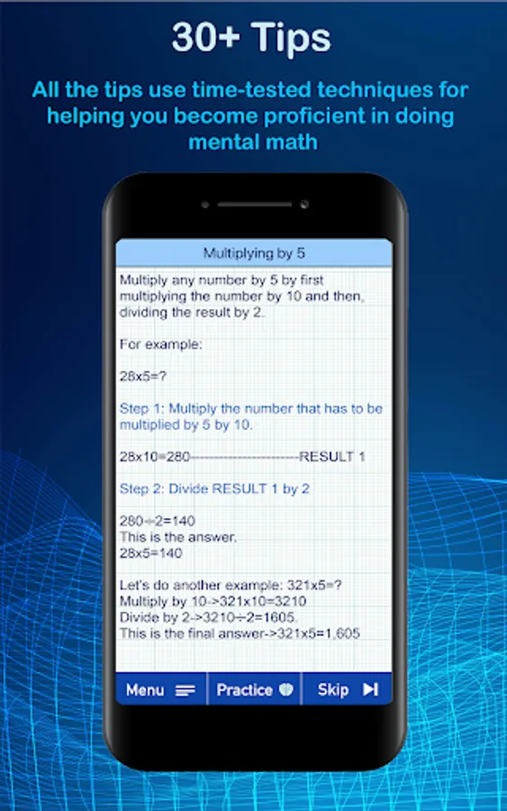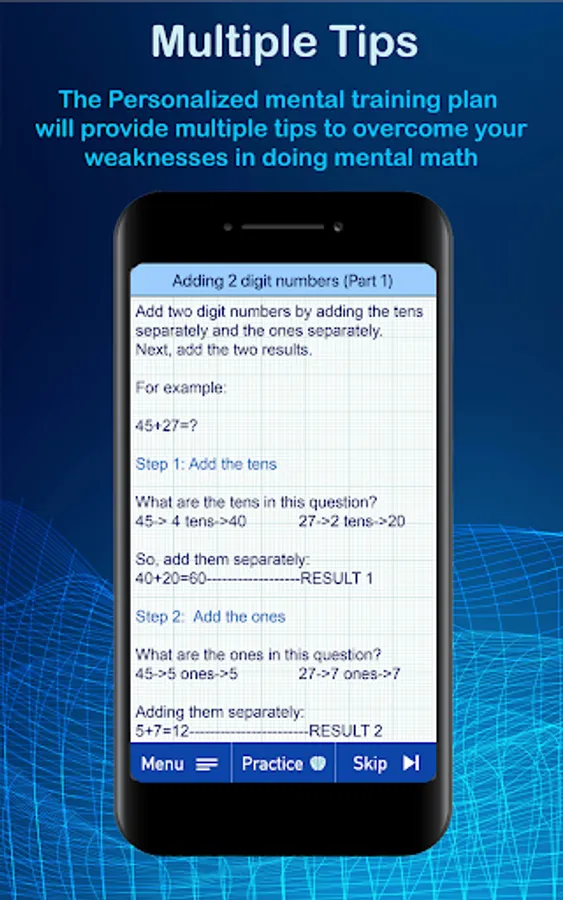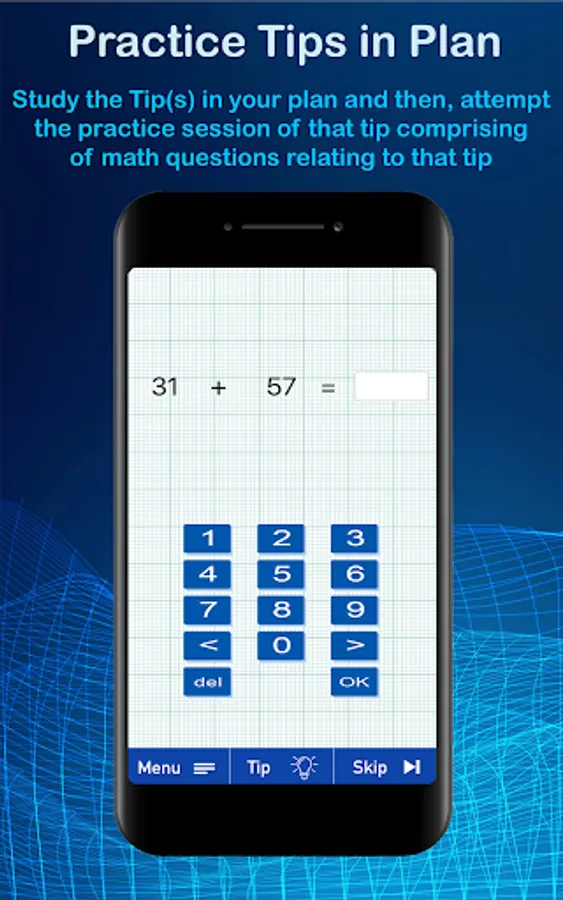 The Mental Math app takes a test to gauge your strengths and weaknesses and based on the result, develops a personalized plan for you. Your personalized plan will give you one or more tips and then, you have to practice using the tip. You are presented with questions relating to that tip so that you master it.
