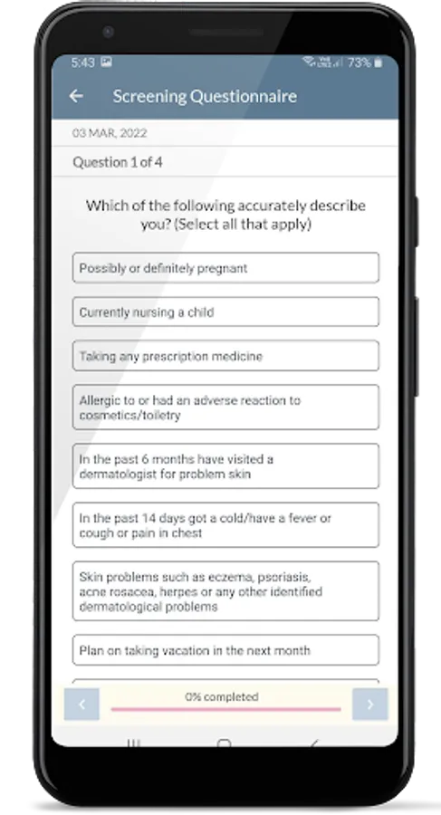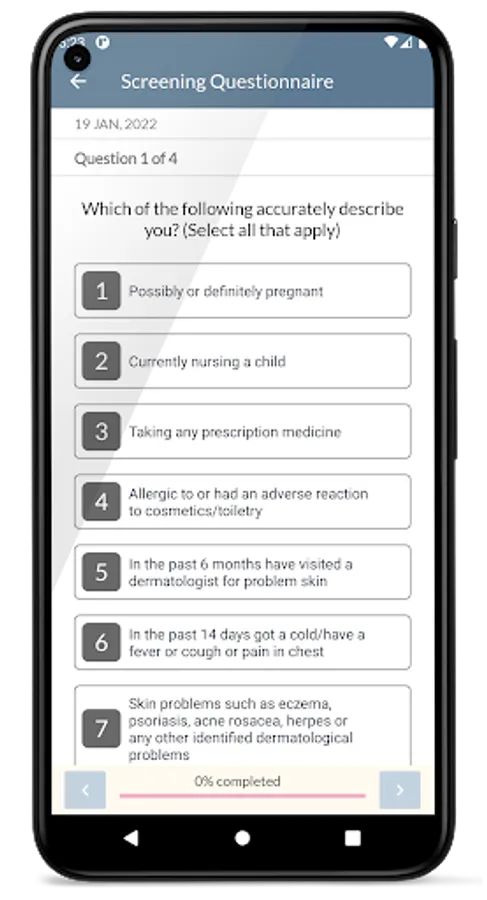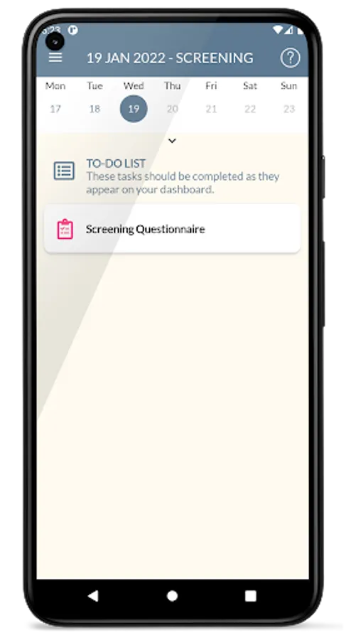 Once the simulated consent process is completed, the users will be presented with a screening questionnaire task. Those that provide responses that mark them as eligible will be invited to continue to the one-day data collection period. Because this is a POC, the responses may be generated for testing purposes rather than being accurate responses from the user.