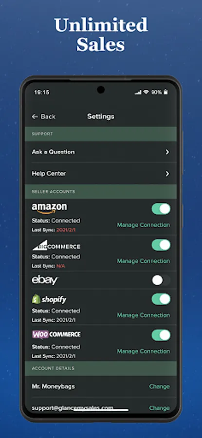 When designing Glance we knew that the initial linking of your accounts had to be simple and quick. Sign into each of your seller central accounts and the Glance servers will do all the work. Combine sales and inventory analytics from all of your accounts in one place. Getting connected and set up is as easy as logging into your selling accounts through the secure mobile app.Glance integrates with all of the following selling accounts: