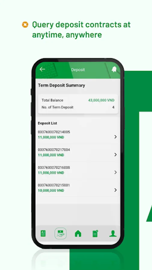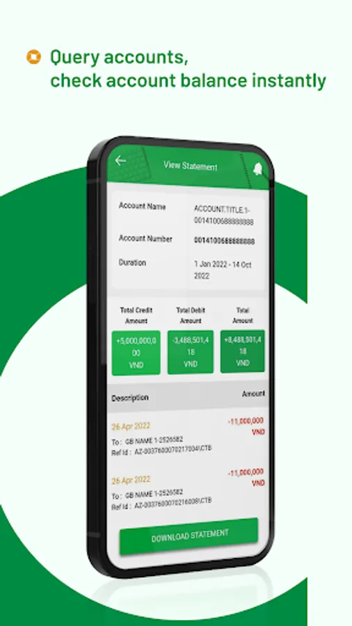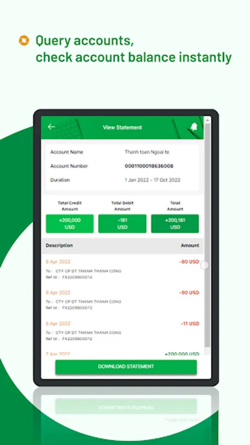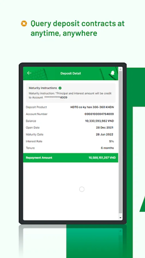 • Manage and query accounts, deposit contracts, review transaction history, easily download full statements at anytime, anywhere.