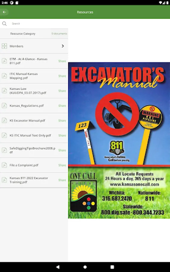 Access a Resource Center with links to the Kansas 811 handbook, excavator guide, color codes and instructional videos. View and share these items with the click of a button.