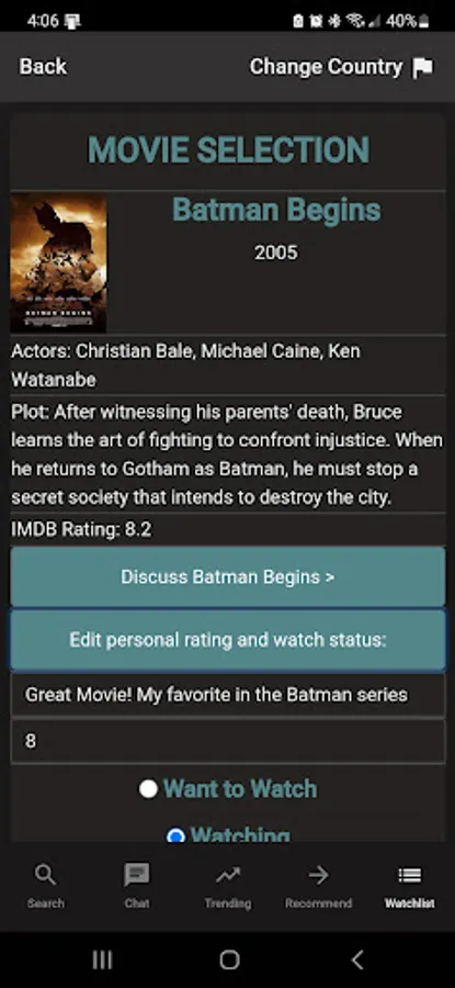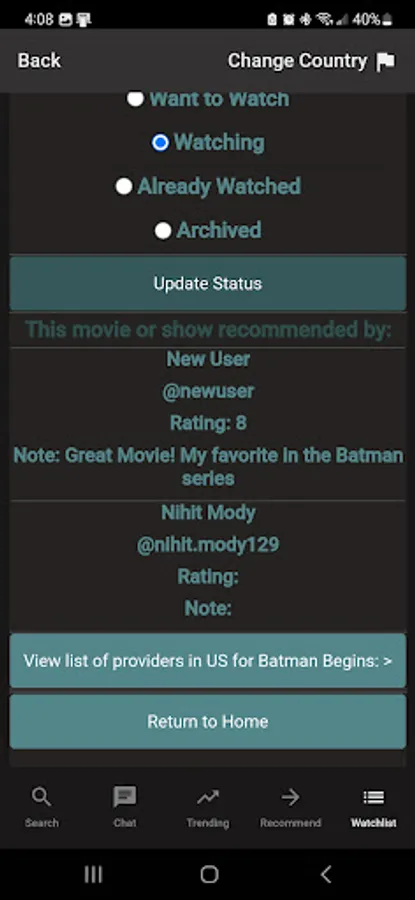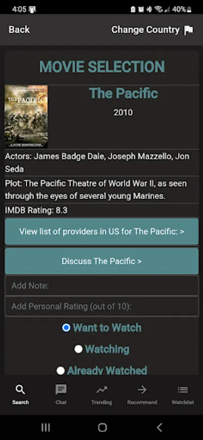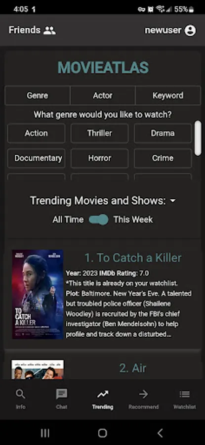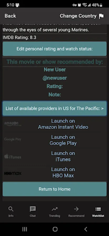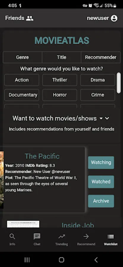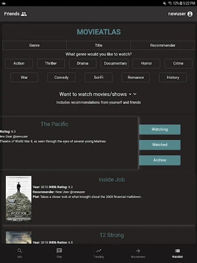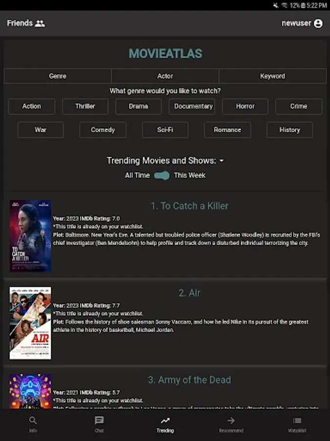 MovieAtlas is an app that allows you to view movie and show recommendations from your friends easily and discuss them. In addition, you can see what's trending and find similar movies and shows, add to your own watchlist and choose to keep your watchlist private or share it and view other friends or public watchlists. You can also view information and ratings, find what provider is carrying the content by country for easy viewing as well as chat with friends.