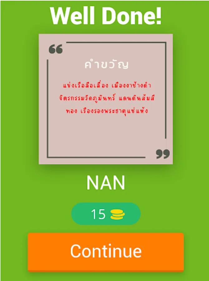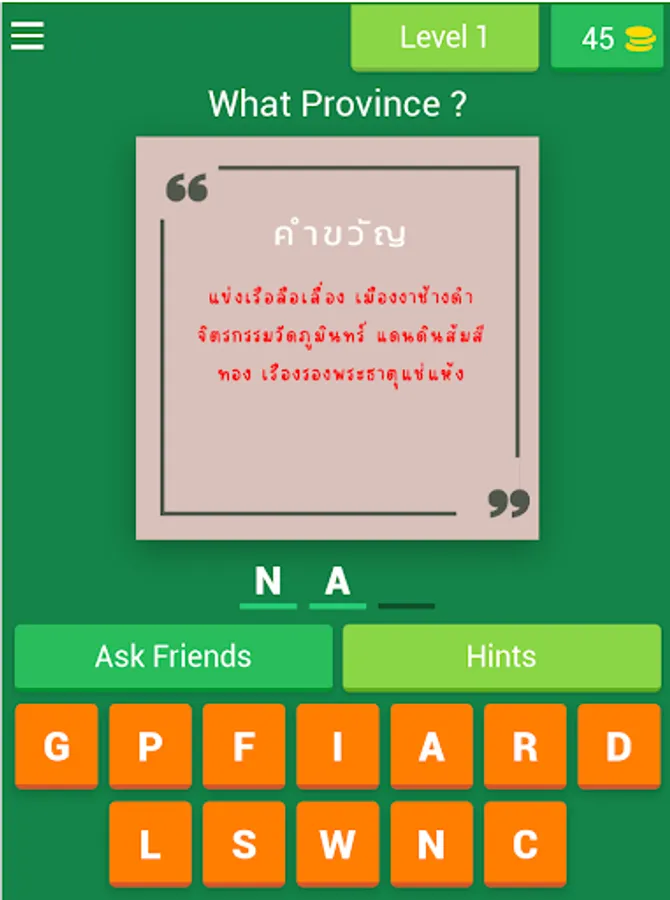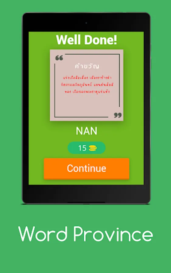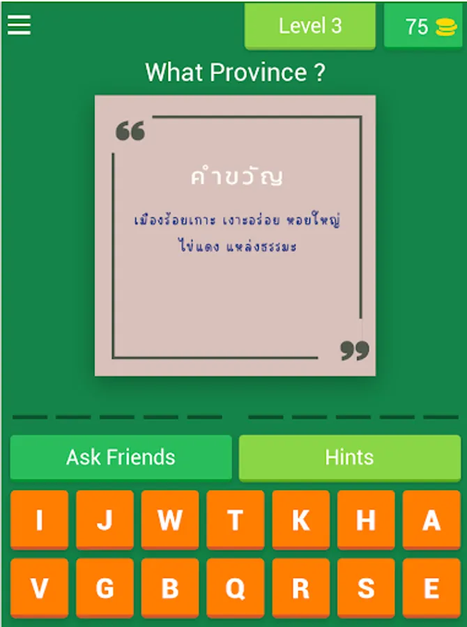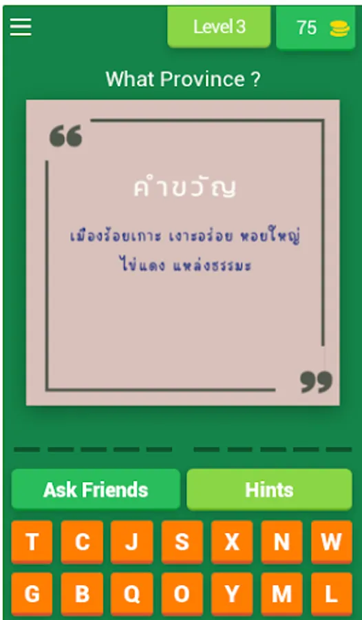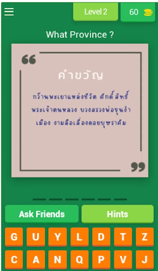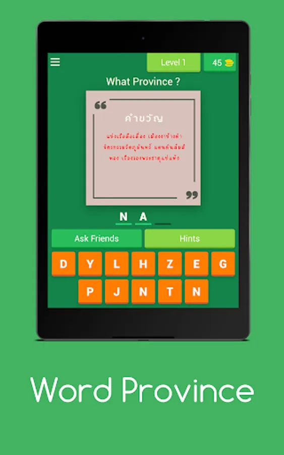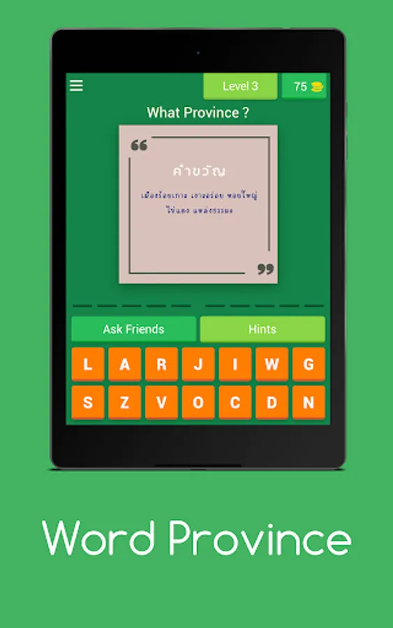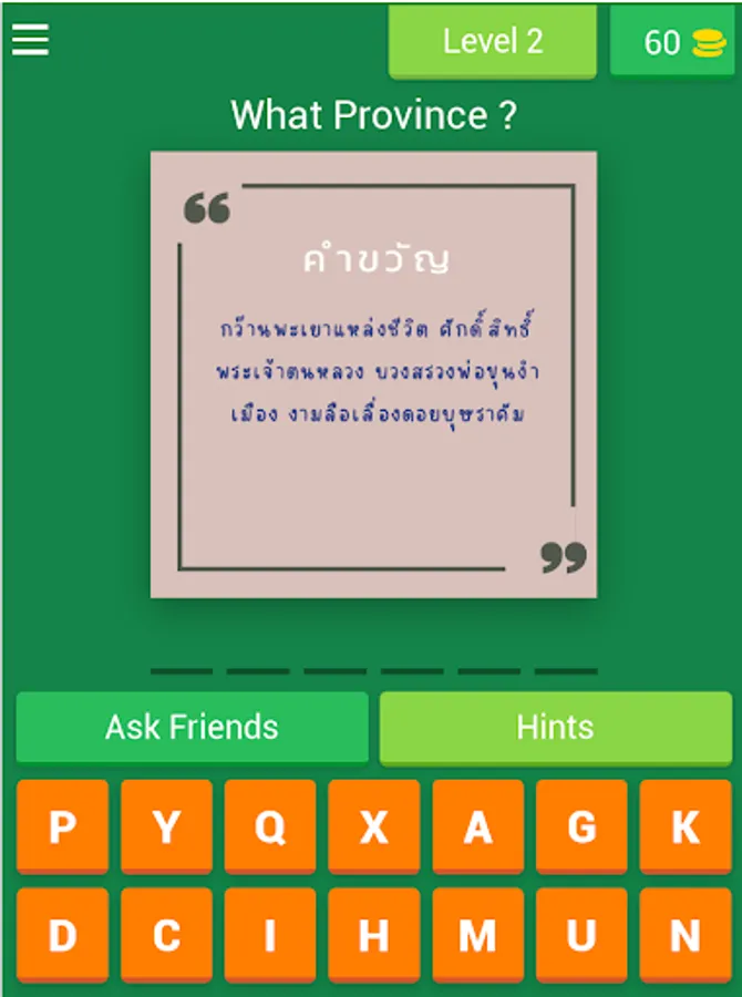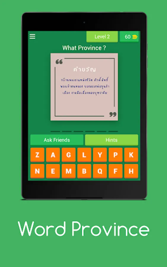 Puzzle game. The motto of the provinces of Thailand. come to guess the name of the province in English Allows you to guess pictures, practice skills, wit