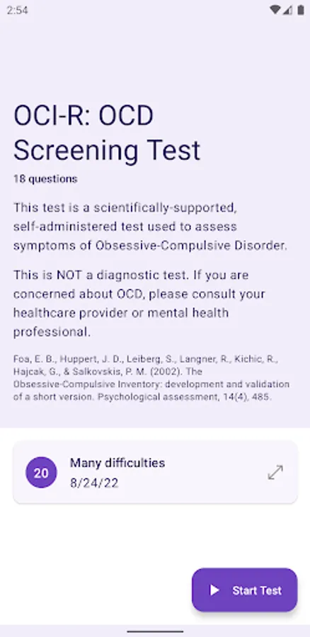 - Start Test: take the OCI-R questionnaire to assess OCD symptoms