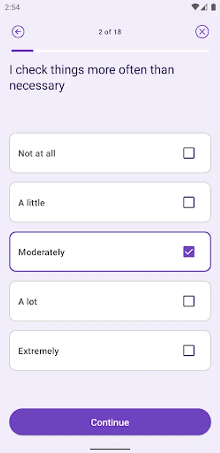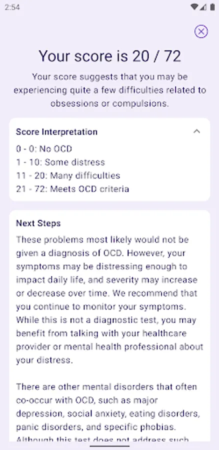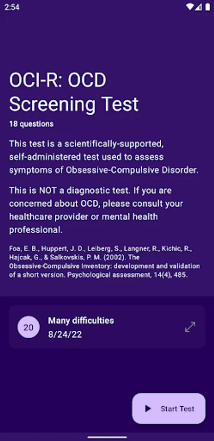 This app is designed to evaluate your symptoms of OCD with a scientifically-supported 18-question test. It uses the Obsessive-Compulsive Inventory - Revised (OCI-R), a screening questionnaire for OCD that is commonly used in research and healthcare settings. The OCI-R is also helpful for monitoring your OCD-related symptoms during and after treatment.