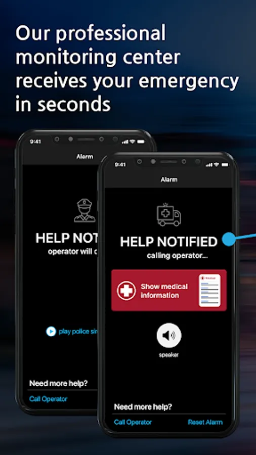 • The app instantly transmits who you are, where you are, and the kind of help you need.