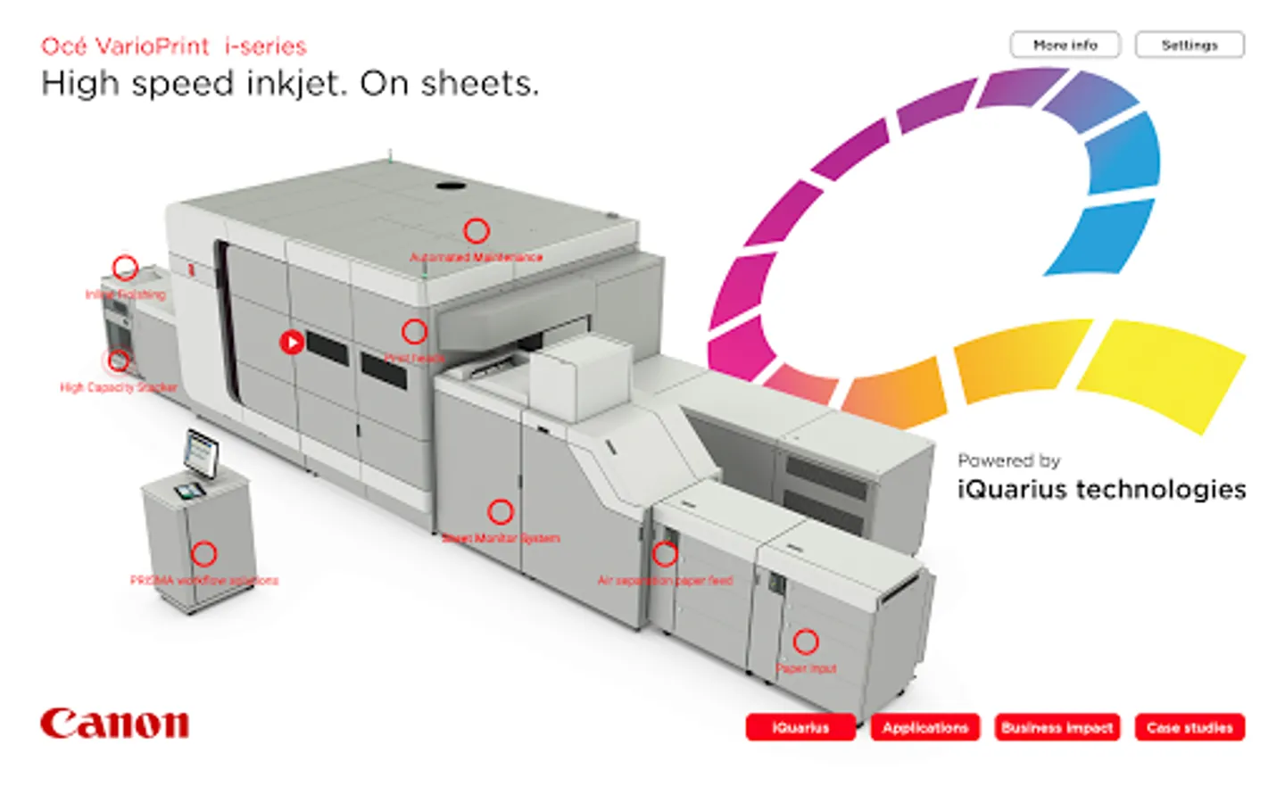 Explore what the Océ VarioPrint i-series offers. Discover groundbreaking iQuarius innovations that enable highspeed inkjet on sheets, by means of small animations. Listen to other customers, who are amazed by its reliability, the uptime and quality of the prints. Or let analyst explain why sheetfed inkjet is a gamechanger for production print environments.