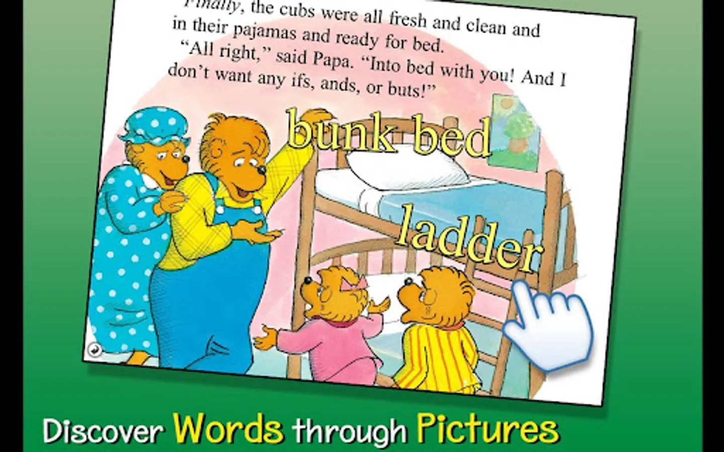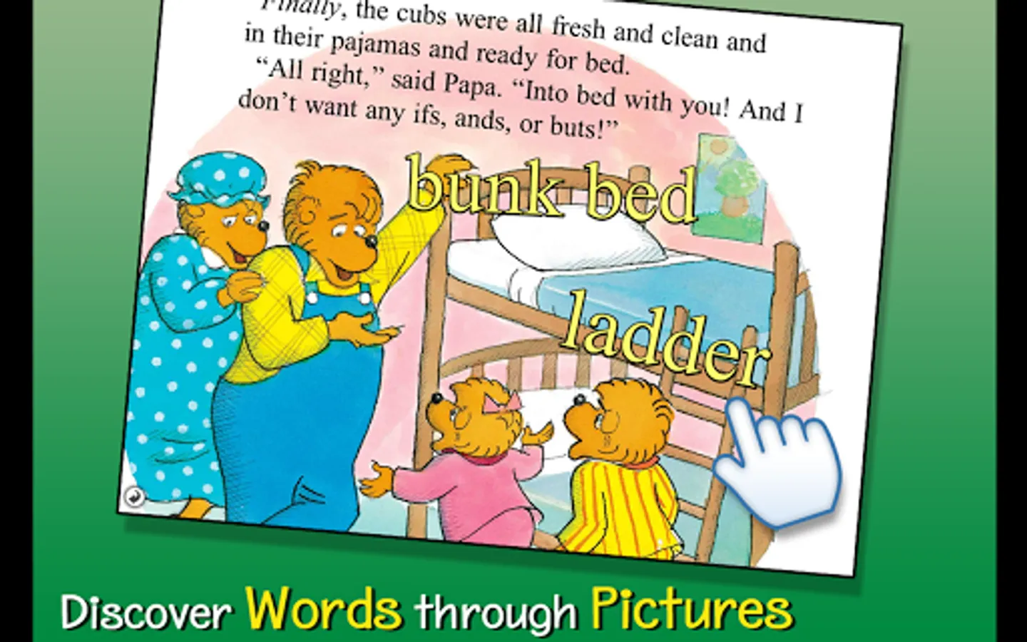 Join the Berenstain Bears in this interactive book app as the sun sets at the treehouse and the nightly bedtime battle begins! Explore pictures, learn new vocabulary, and follow along with three fun ways to read! Will Mama and Papa be able to get Brother and Sister all tucked away in their beds?