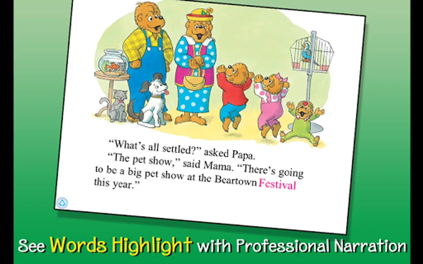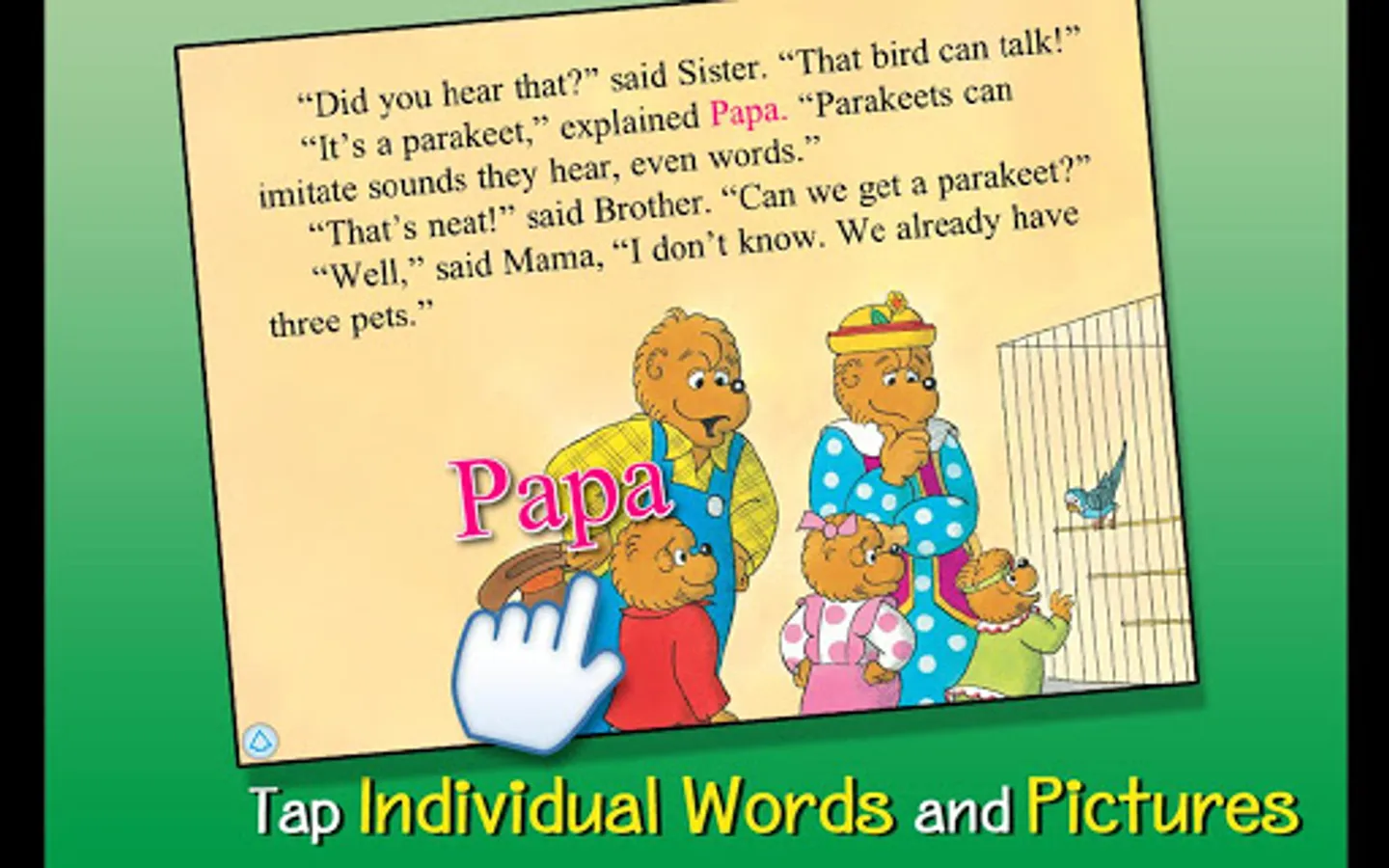 Join the Berenstain Bears in this interactive book app as they get a new pet parakeet just in time for the big pet show at the annual Beartown Festival! Explore pictures, learn new vocabulary, and follow along with three fun ways to read! Will the Bears go home with a blue ribbon from Mayor Honeypot?
