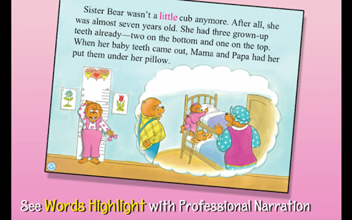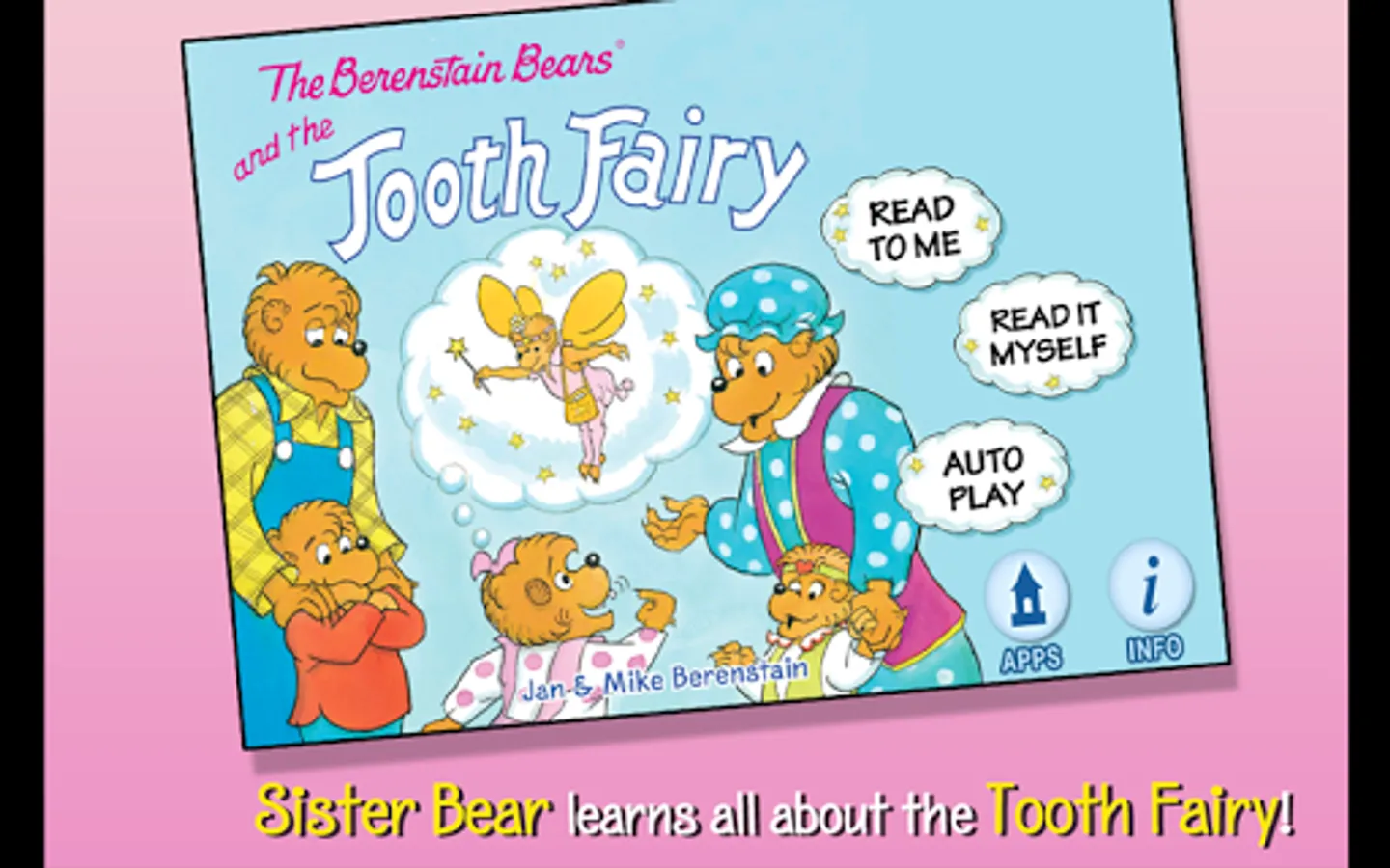 Join the Berenstain Bears in this interactive book app as Sister Bear loses a tooth and gets a visit from the Tooth Fairy! Explore pictures, learn new vocabulary, and follow along with three fun ways to read! What lesson will Sister learn when she finds out that her best friend Lizzy got even more money for the tooth she lost?