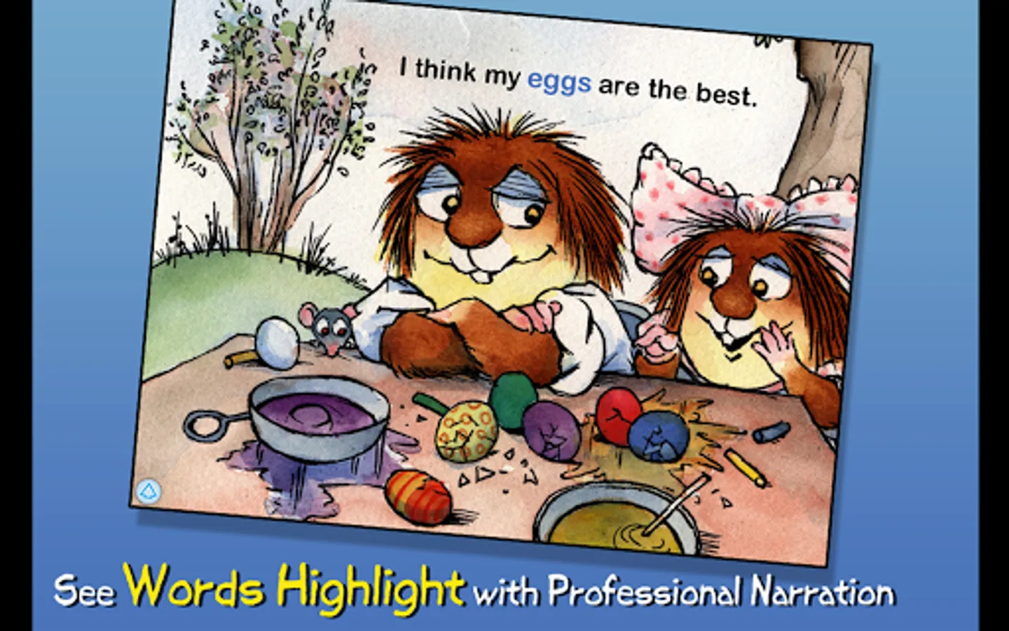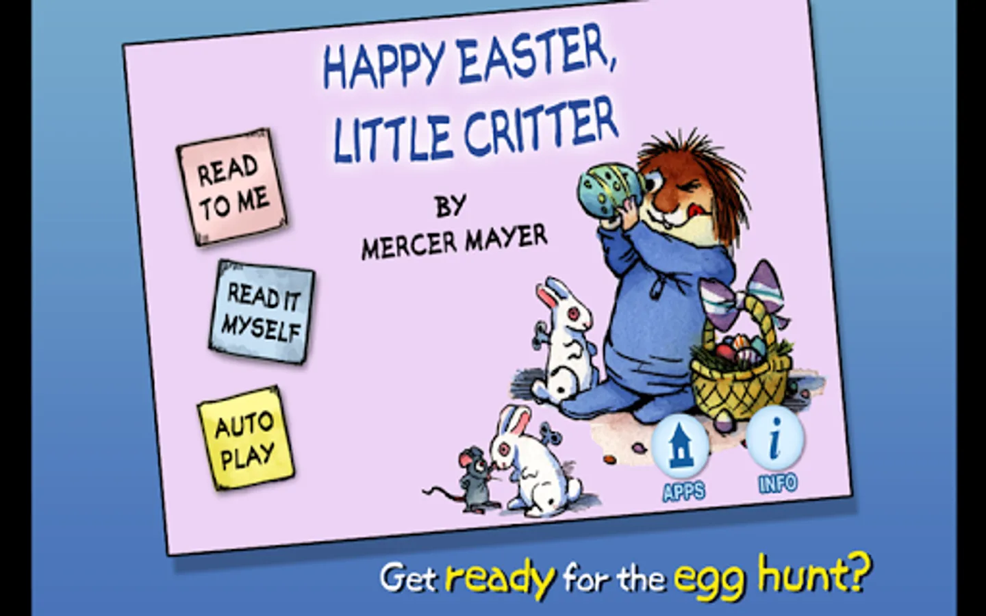 Join Little Critter and his family in this interactive book app as they celebrate Easter! Explore pictures, learn new vocabulary, and follow along with three fun ways to read! Go on your very own Easter egg hunt to find 100 eggs hidden throughout the story as Little Critter enjoys all the traditional Easter activities!