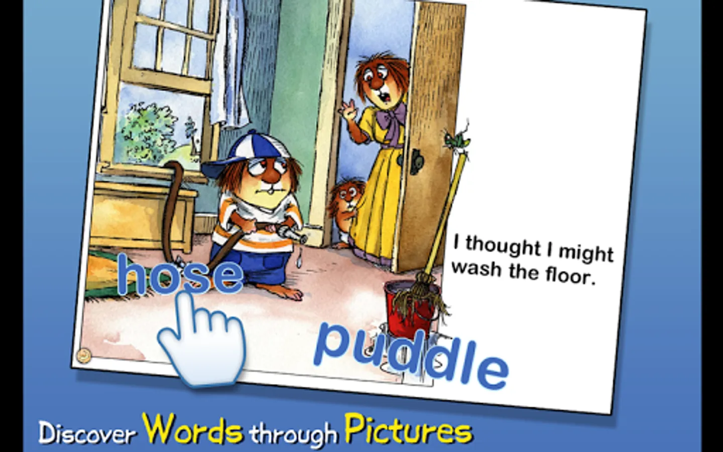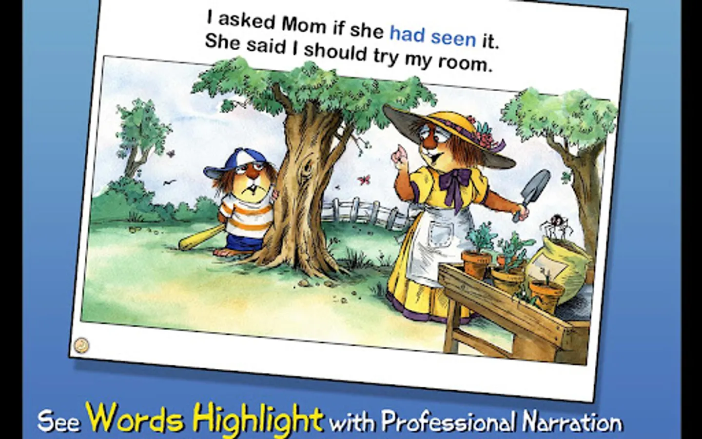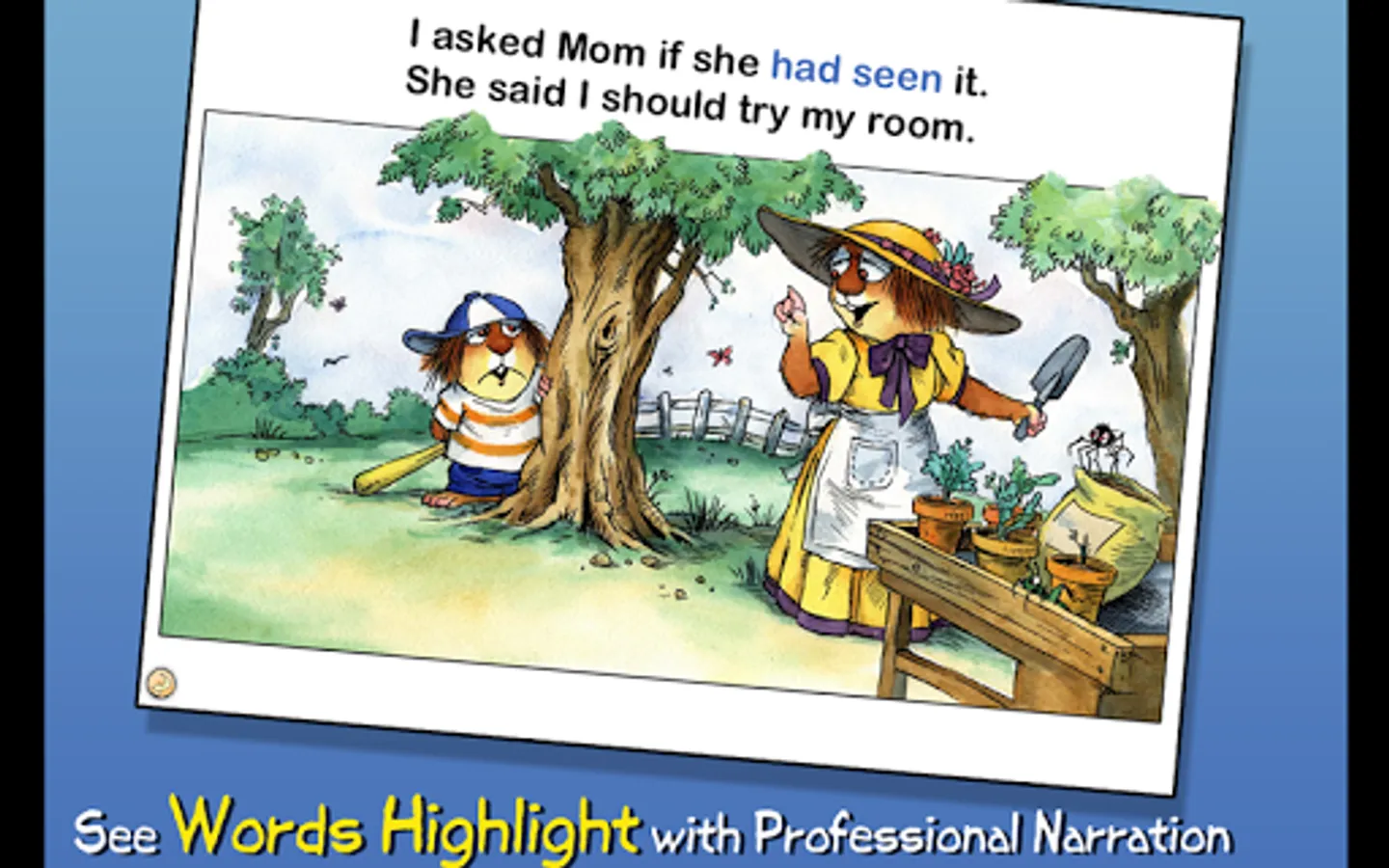 Join Little Critter in this interactive book app as he attempts to find his baseball mitt in his room that is "just a mess"! Explore pictures, learn new vocabulary, and follow along with three fun ways to read! His unique attempts at cleaning, accompanied with humorous illustrations, will leave you laughing and wondering if he will ever find his baseball mitt.
