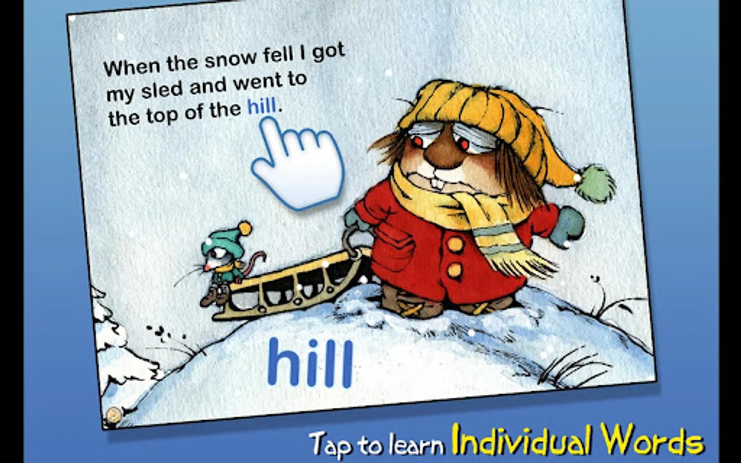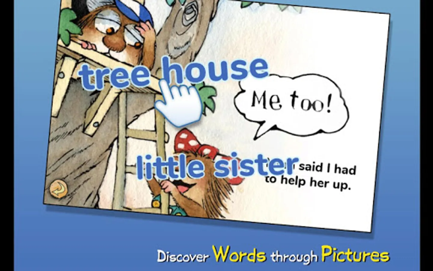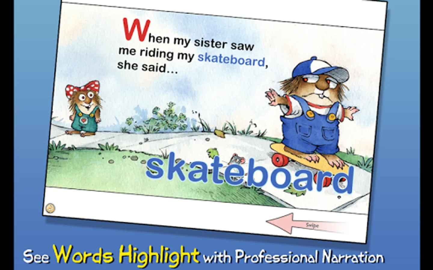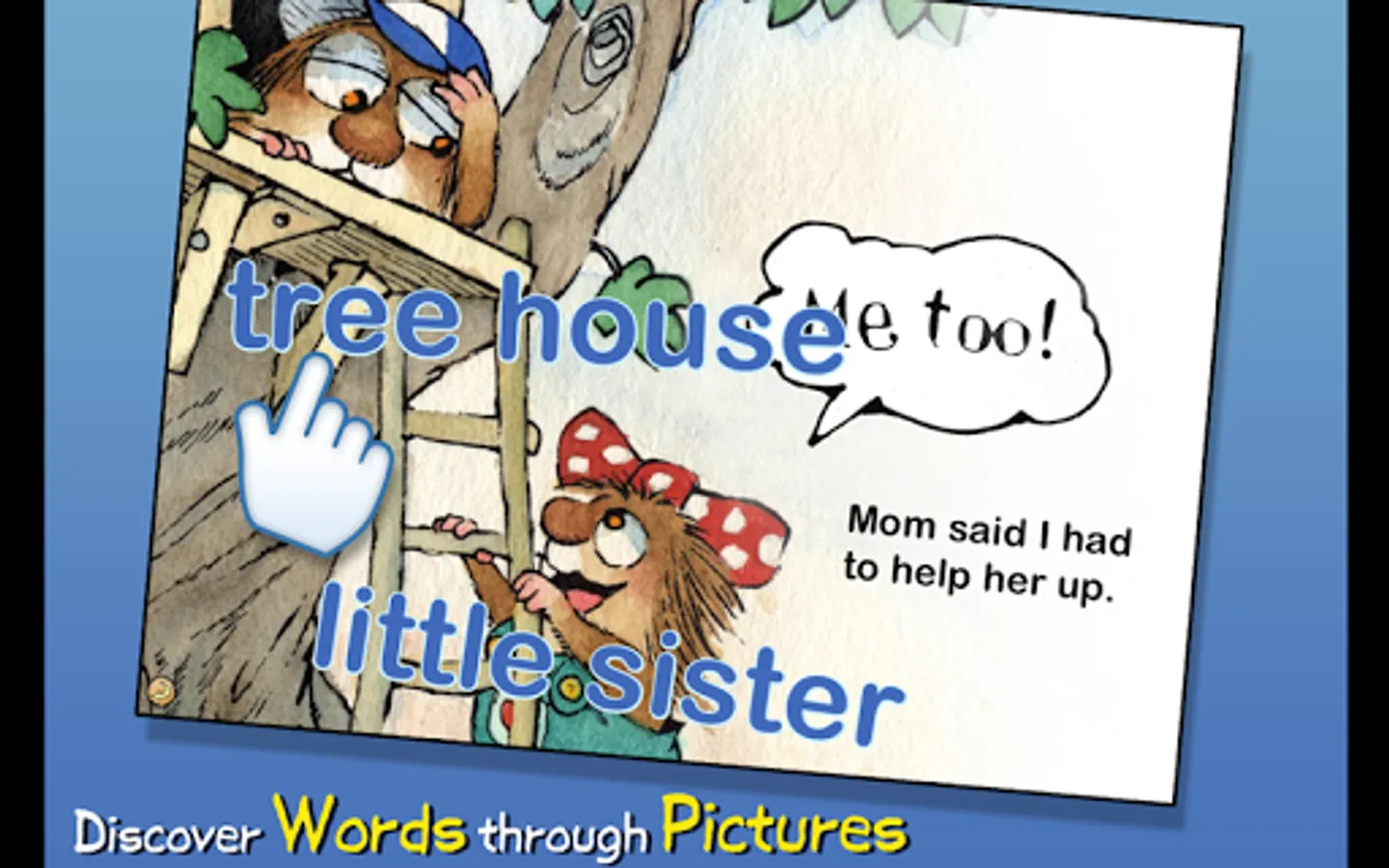 Join Little Critter in this interactive book app as his little sister tags along wherever he goes, saying "Me Too!" to everything from playing football with his friends to eating the last piece of cake! Explore pictures, learn new vocabulary, and follow along with three fun ways to read! Jump inside to find out how Little Critter learn that sharing with your siblings is good because sometimes they share back!