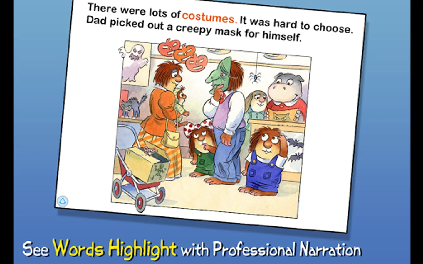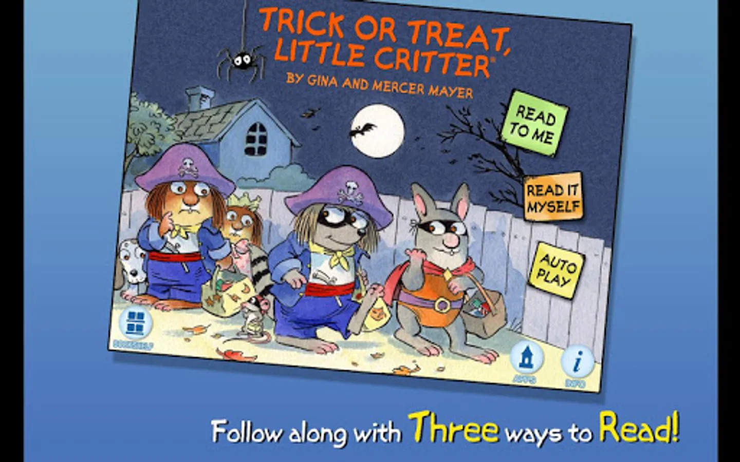 Join Little Critter in this interactive book app as he gets ready for Halloween! Explore pictures, learn new vocabulary, and follow along with three fun ways to read! From costumes to jack-o-lanterns, how will Little Critter prepare to go trick-or-treating?