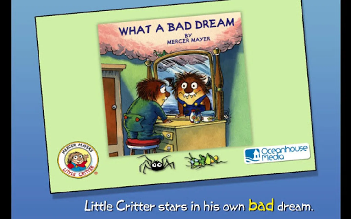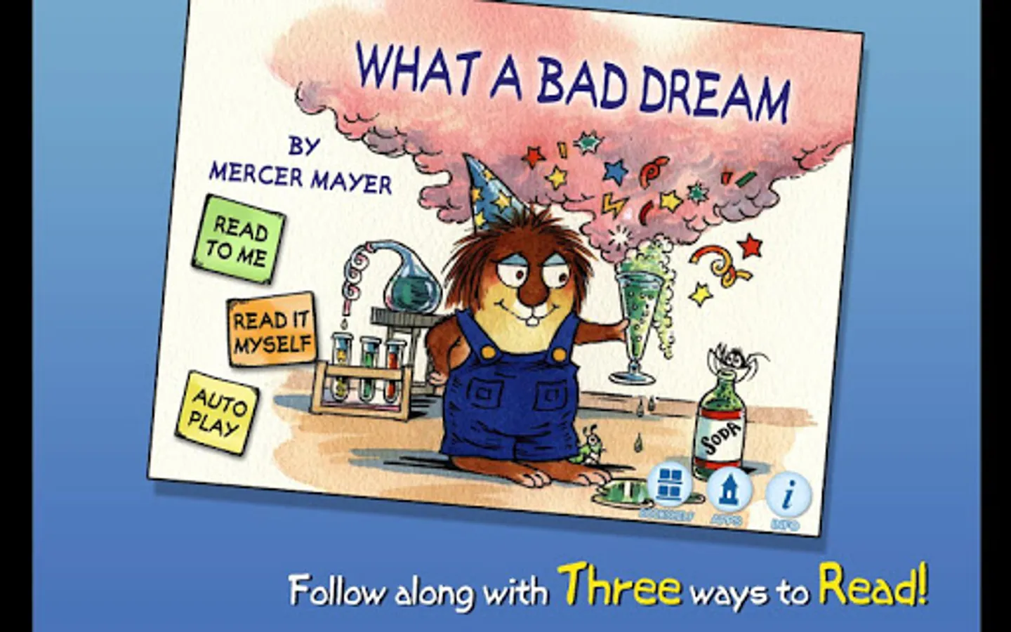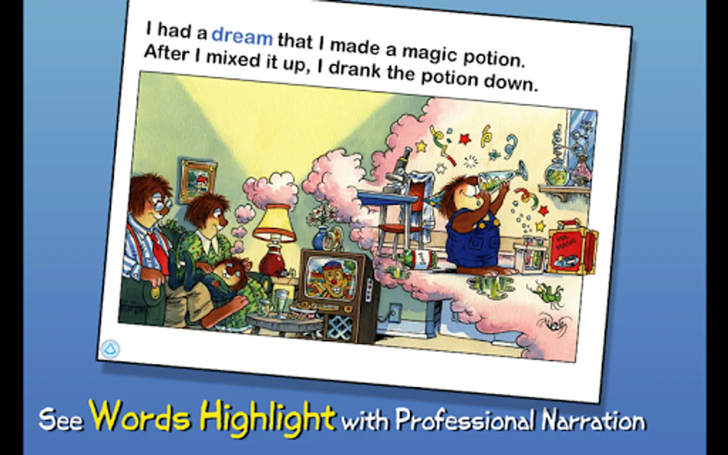 Join Little Critter in this interactive book app as he has a bad dream that a magic potion turns him into a scary, disagreeable monster that no one wants to be around! Explore pictures, learn new vocabulary, and follow along with three fun ways to read! Young children will relate to the sweet and funny ending when Little Critter finds out that it was just a bad dream!