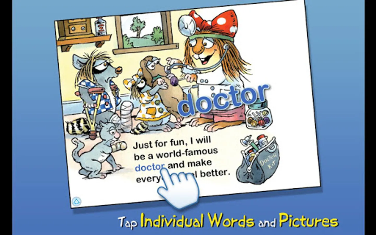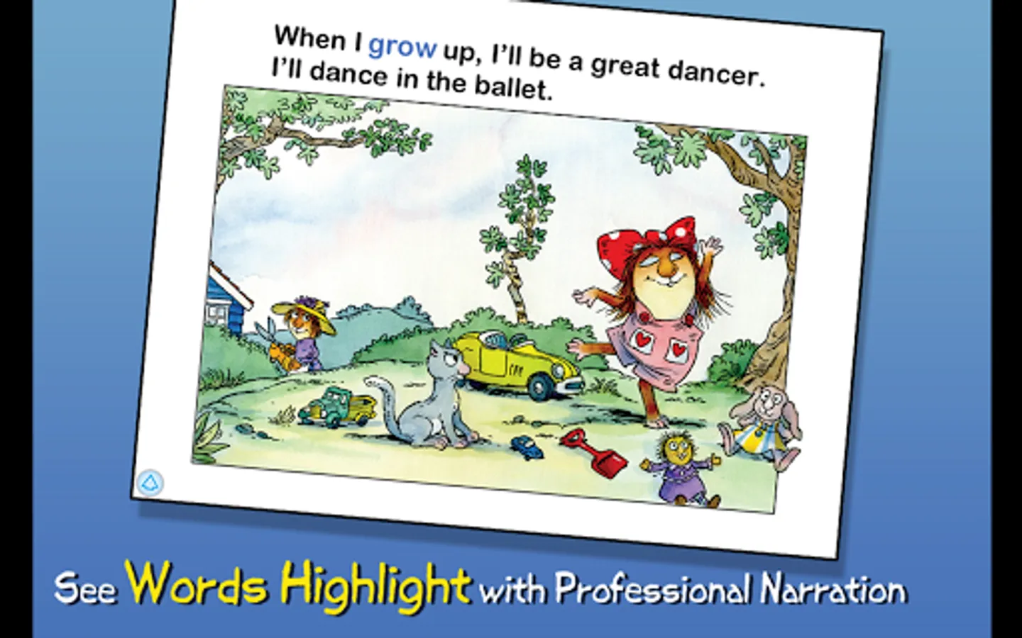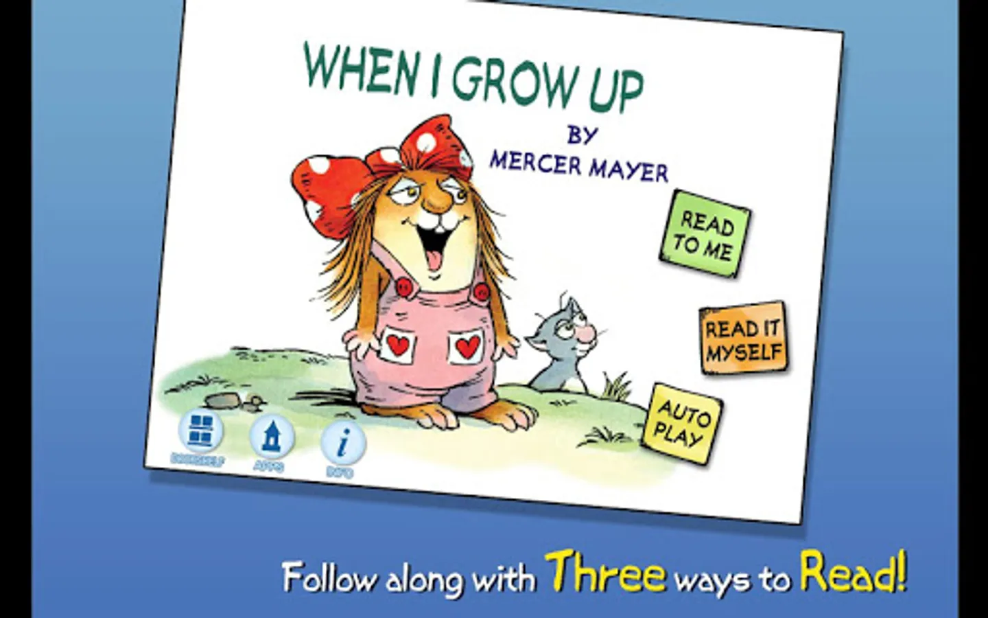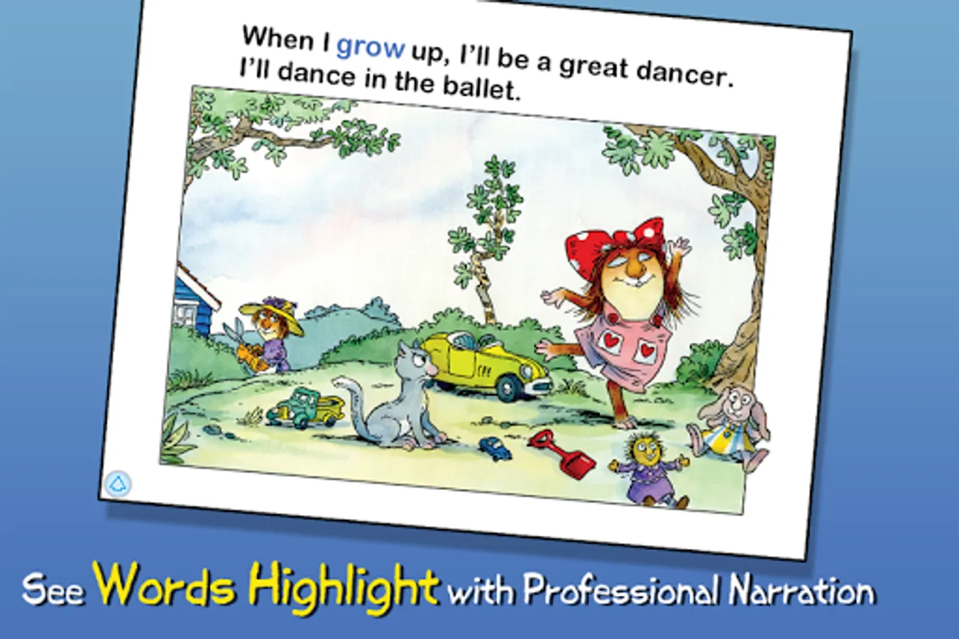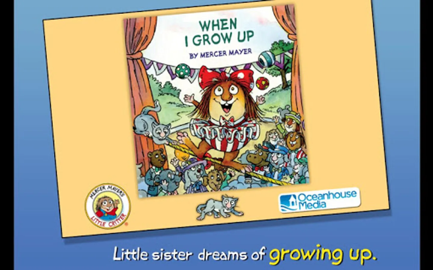 Join Little Critter's sister in this interactive book app as she envisions all the wonderful things she'll do when she grows up! Explore pictures, learn new vocabulary, and follow along with three fun ways to read! Her aspirations to be a great ballerina, a courageous fire chief, a world-famous doctor, and more will inspire young readers to think about what they'd like to be when they grow up!