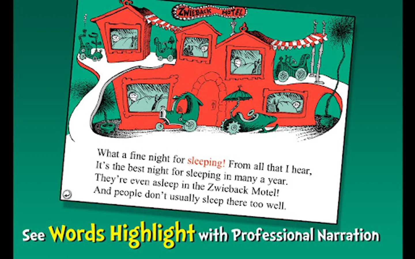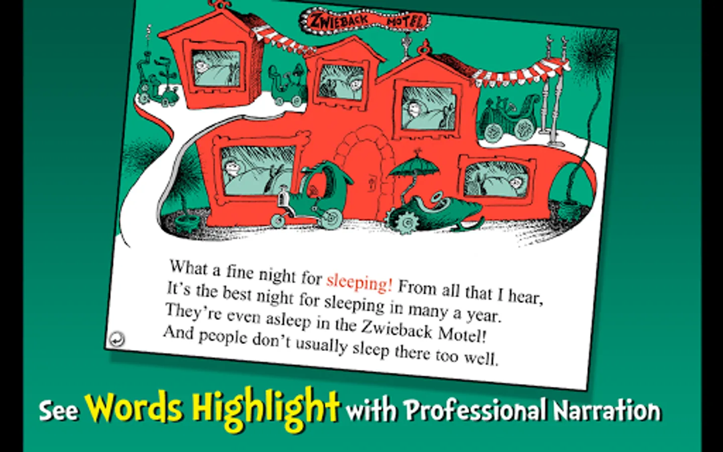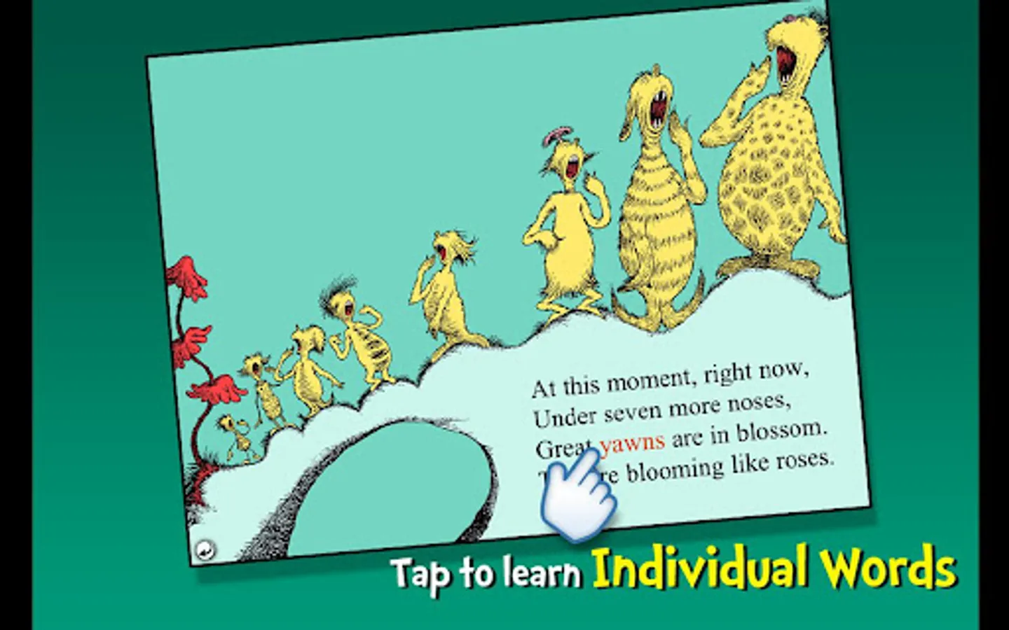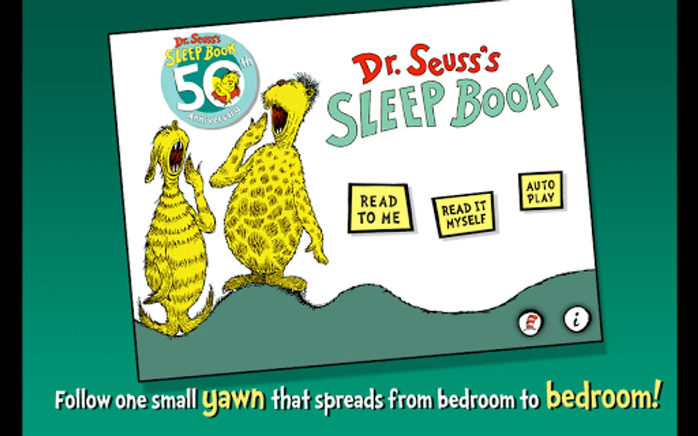 Say goodnight with Dr. Seuss in this interactive book app as one yawn spreads from bedroom to bedroom until ninety-nine zillion, nine trillion and three Seussian creatures are sound asleep! Explore pictures, learn new vocabulary, and follow along with three fun ways to read! Catch the contagious yawn with this book app perfect for nap or bedtime!