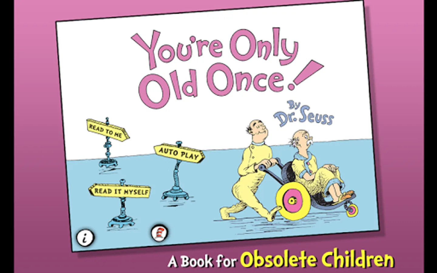 Follow Dr. Seuss's Everyman in this interactive book app as he is submitted to a battery of medical tests and checkups with the experts at the Golden Years Clinic. Explore pictures, learn new vocabulary, and follow along with three fun ways to read! If laughter is the best medicine, then "You’re Only Old Once!" is a delightful defense against aging!