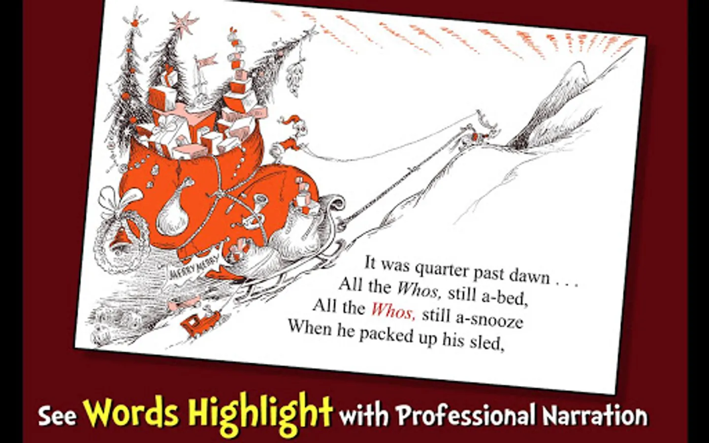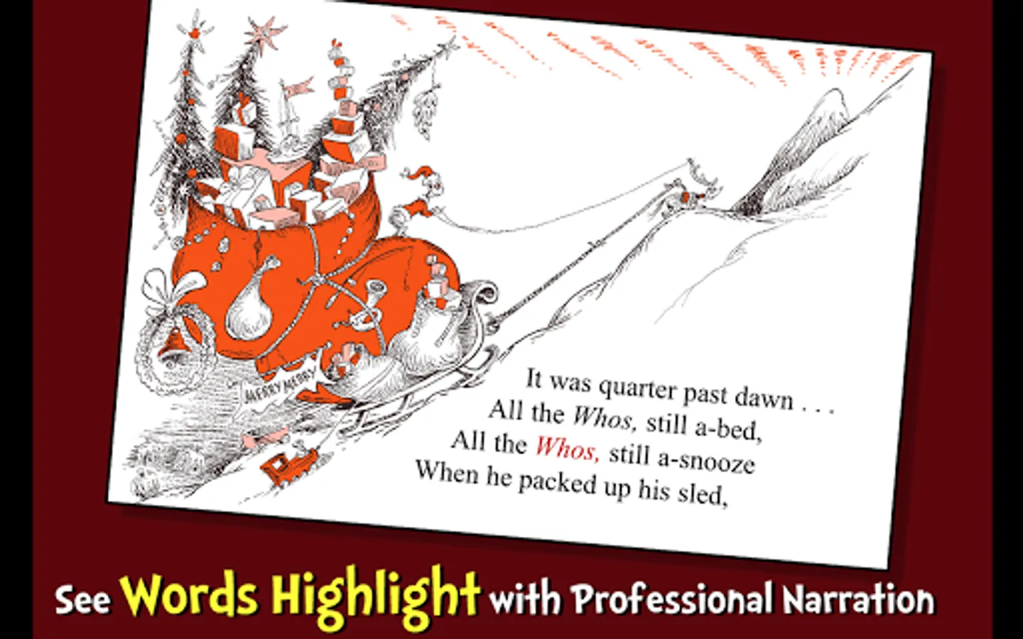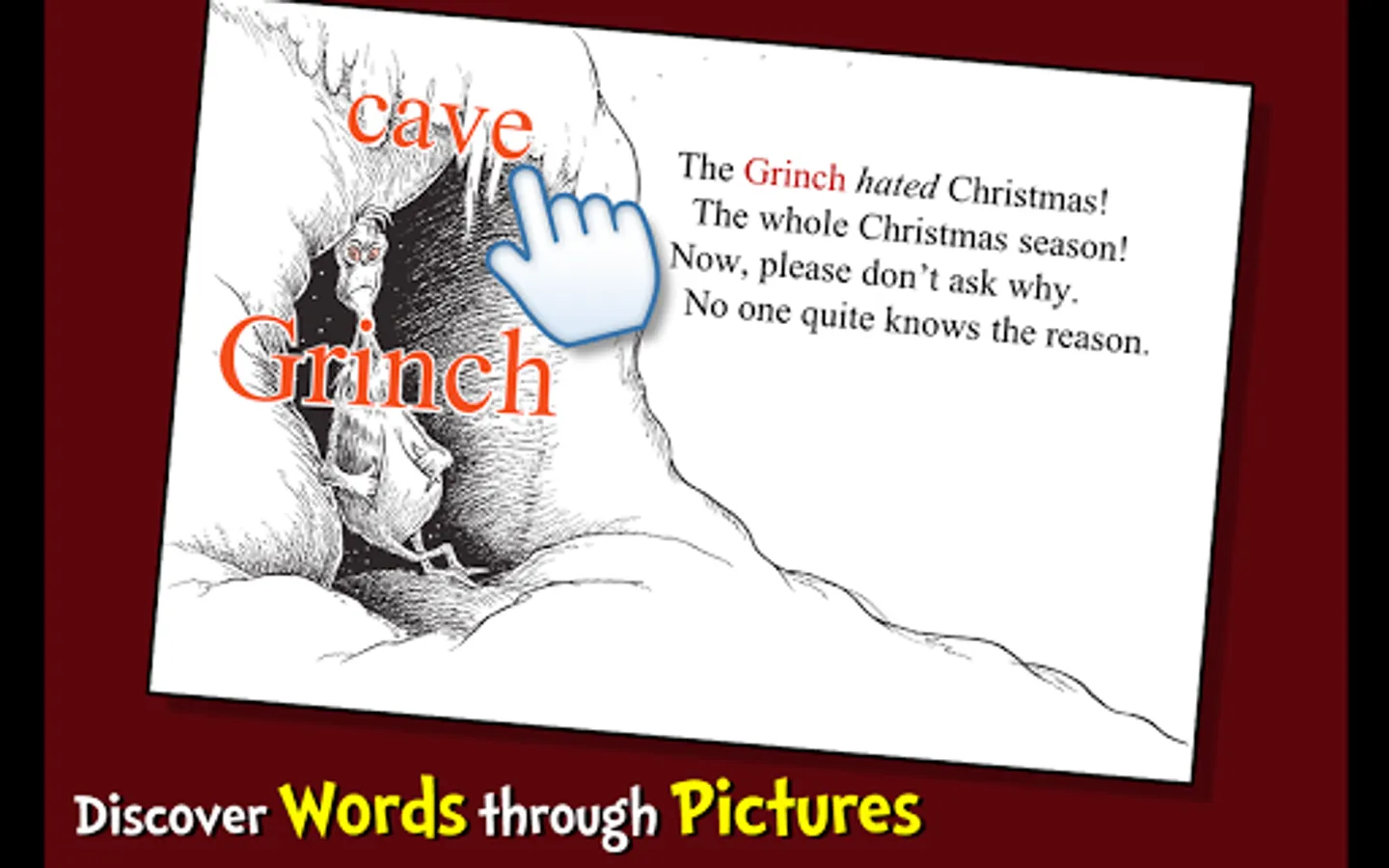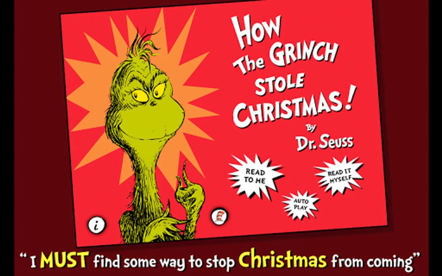 Join the bitter and grouchy Grinch in this interactive book app classic from Dr. Seuss as he attempts to "keep Christmas from coming" to the warm-hearted land of Whoville. Explore pictures, learn new vocabulary, and follow along with three fun ways to read! Will the Grinch succeed at depriving the Whos from Christmas?