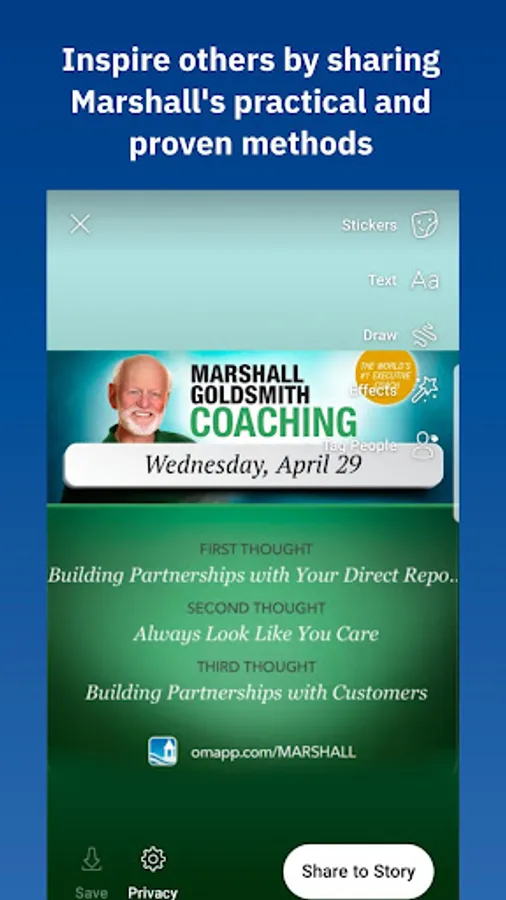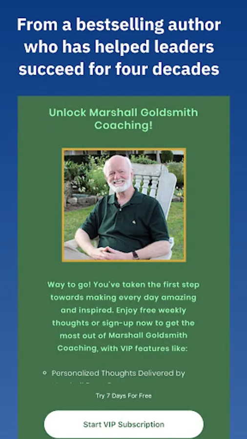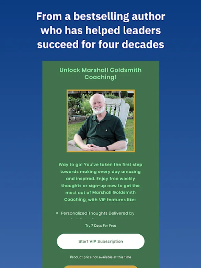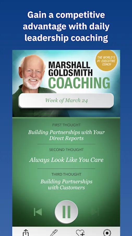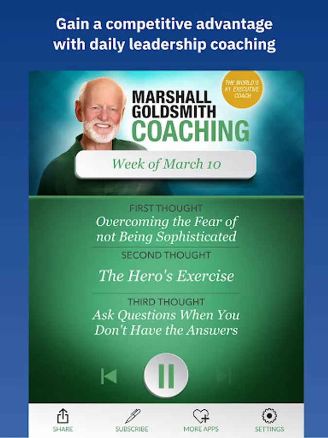 Gain a competitive advantage with Marshall Goldsmith Coaching, the #1 app in leadership development and executive coaching featuring personalized coaching sessions with Marshall Goldsmith. Over one million professionals and organizations follow NYTimes best-selling author Marshall Goldsmith on LinkedIn for his best-in-class leadership and executive coaching and now Marshall Goldsmith Coaching brings his world-renowned leadership training directly to you in a one-of-a-kind experience that can’t be found anywhere else. Start for FREE today!