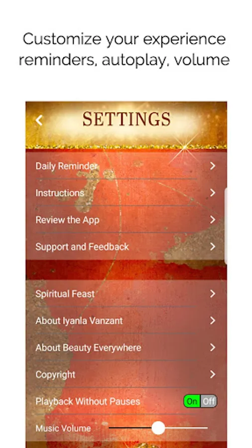Now you can get your own personalized pep-talk from Iyanla Vanzant every single day. With our Alarm feature you can wake up to a custom spiritual coaching lesson from Iyanla instead of that annoying alarm in the morning. With the reminder feature, you can choose the time each day you’d like to be reminded for your custom spiritual coaching lesson from Iyanla. For example, listen after waking up, during lunch or just before bed as Iyanla’s magical soothing voice leads you through your own daily principles and affirmations toward gaining your own guidance and inner peace.