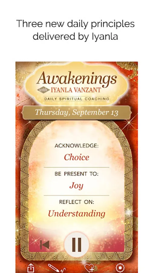 Awakenings with Iyanla is completely free and will guide you through three weekly principles. After that, by subscription, gain access to the full Awakenings with Iyanla Vanzant app features including 3 personal daily guiding principles, alarm feature and exclusive access to Iyanla’s Spiritual Feast audio. Each day, spend just three minutes listening as Iyanla delivers three personalized principles she has selected just for you.