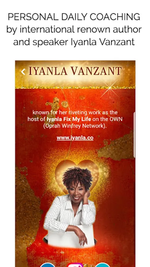 Host and executive producer of the No.1 reality show on OWN: Oprah Winfrey Network, Iyanla Vanzant now offers her new Daily Spiritual Coaching App. Known for her award-winning breakout hit “Iyanla: Fix My Life,” where she goes behind closed doors and deep inside people’s lives revealing emotionally riveting experiences, Iyanla applies spiritual principles to help people gain inner peace and guidance on a path to healing.