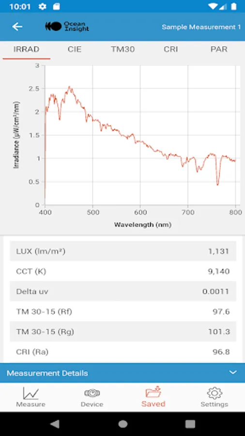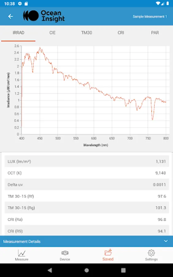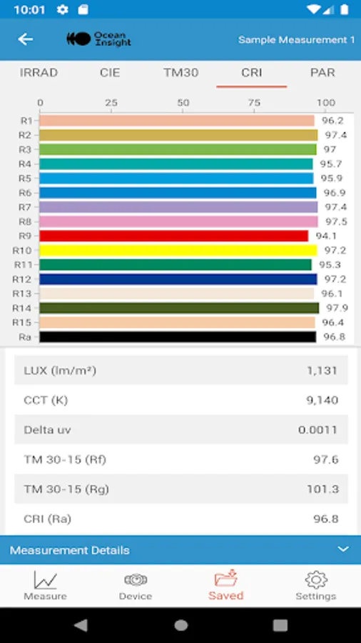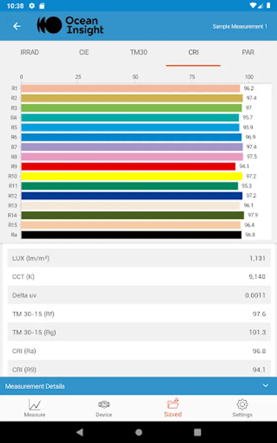 - Lux, CRI (Ra, R1 – R15), CCT, TM30